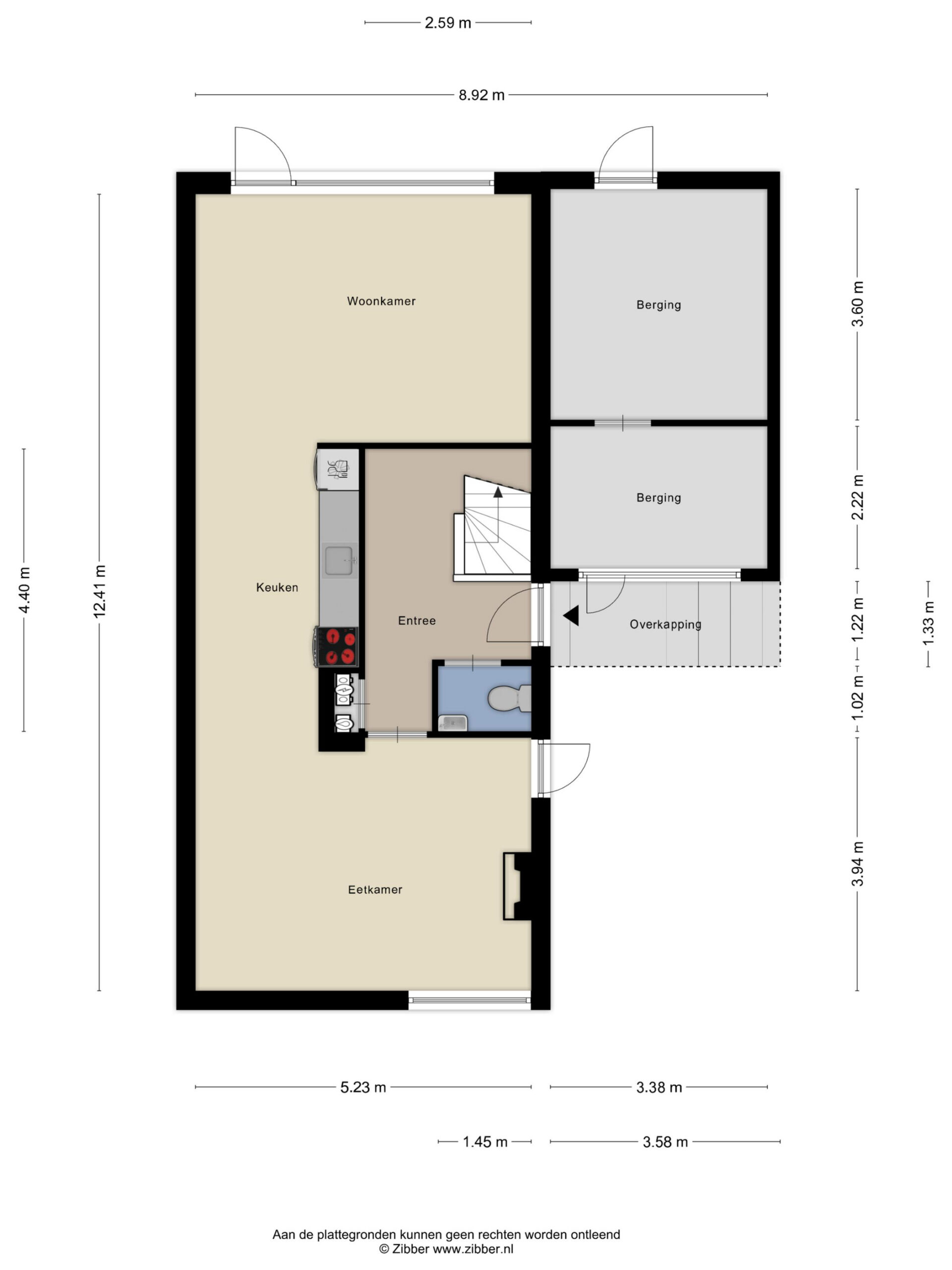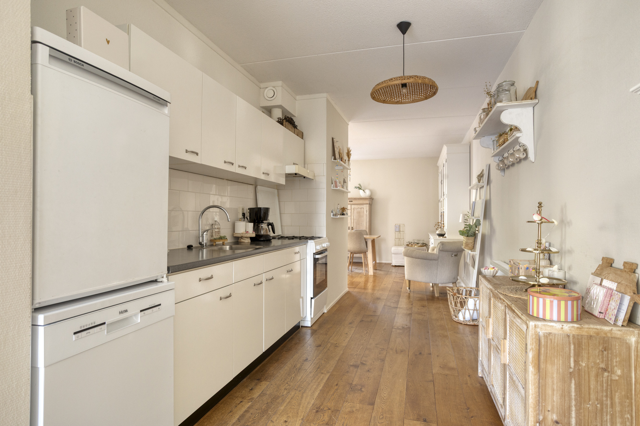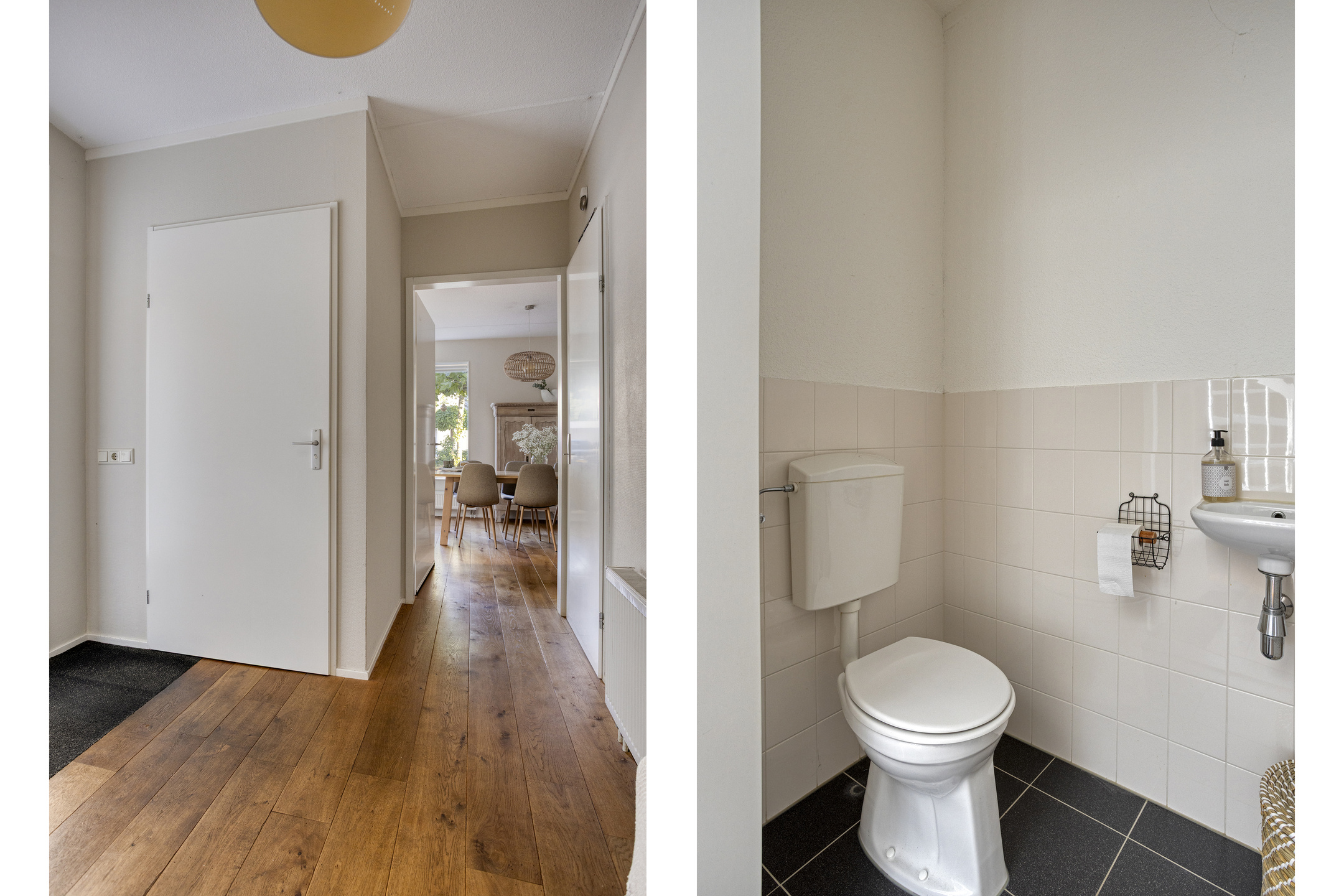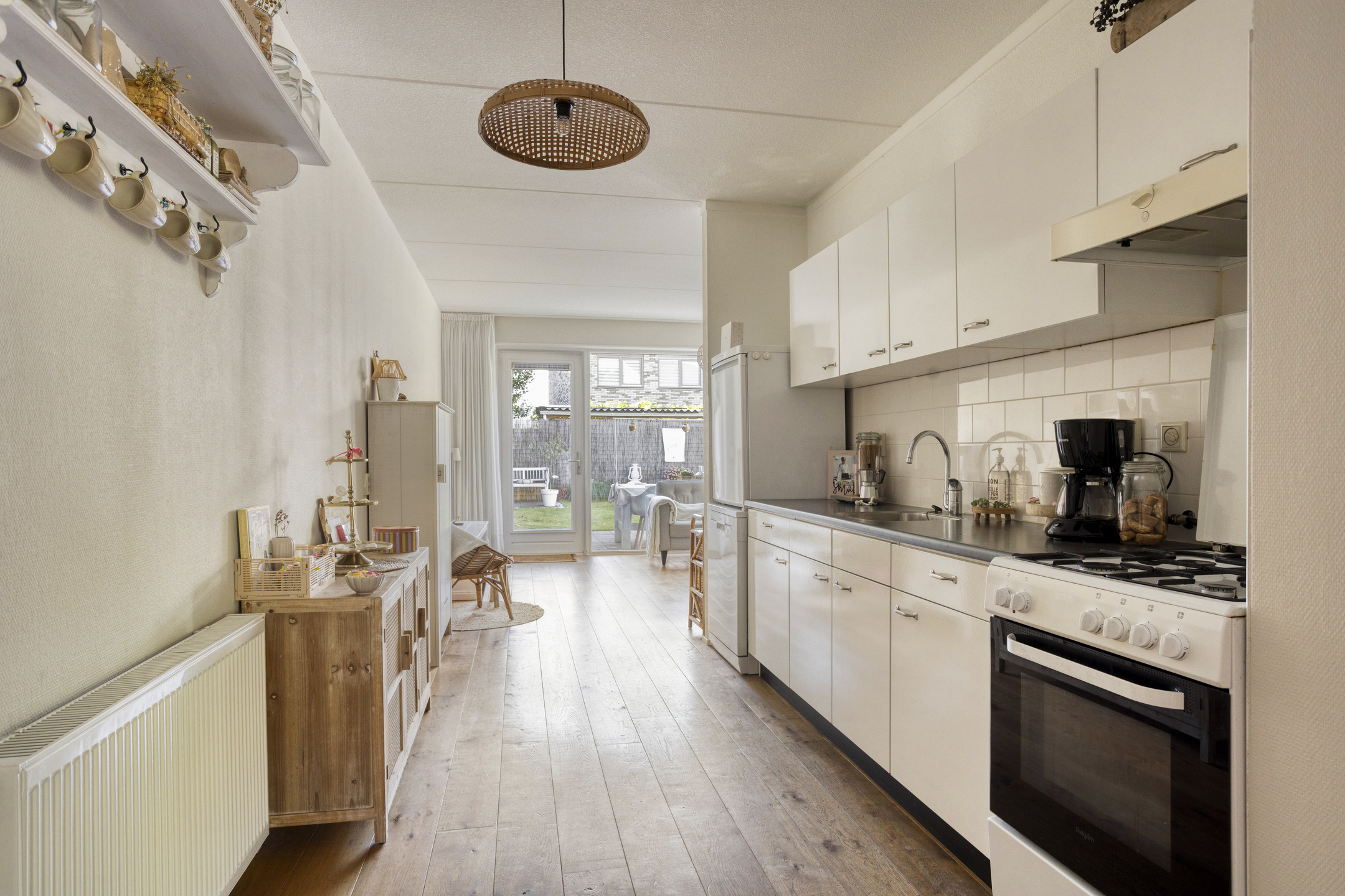 Entree via de hal met meterkast, toilet en trapopgang. De woonkamer is licht en ruim, met uitzicht op de tuin aan de achterzijde. Aan de voorzijde eetkamer met in het midden de keuken. Via de deur in de woonkamer loop je zo de tuin in.