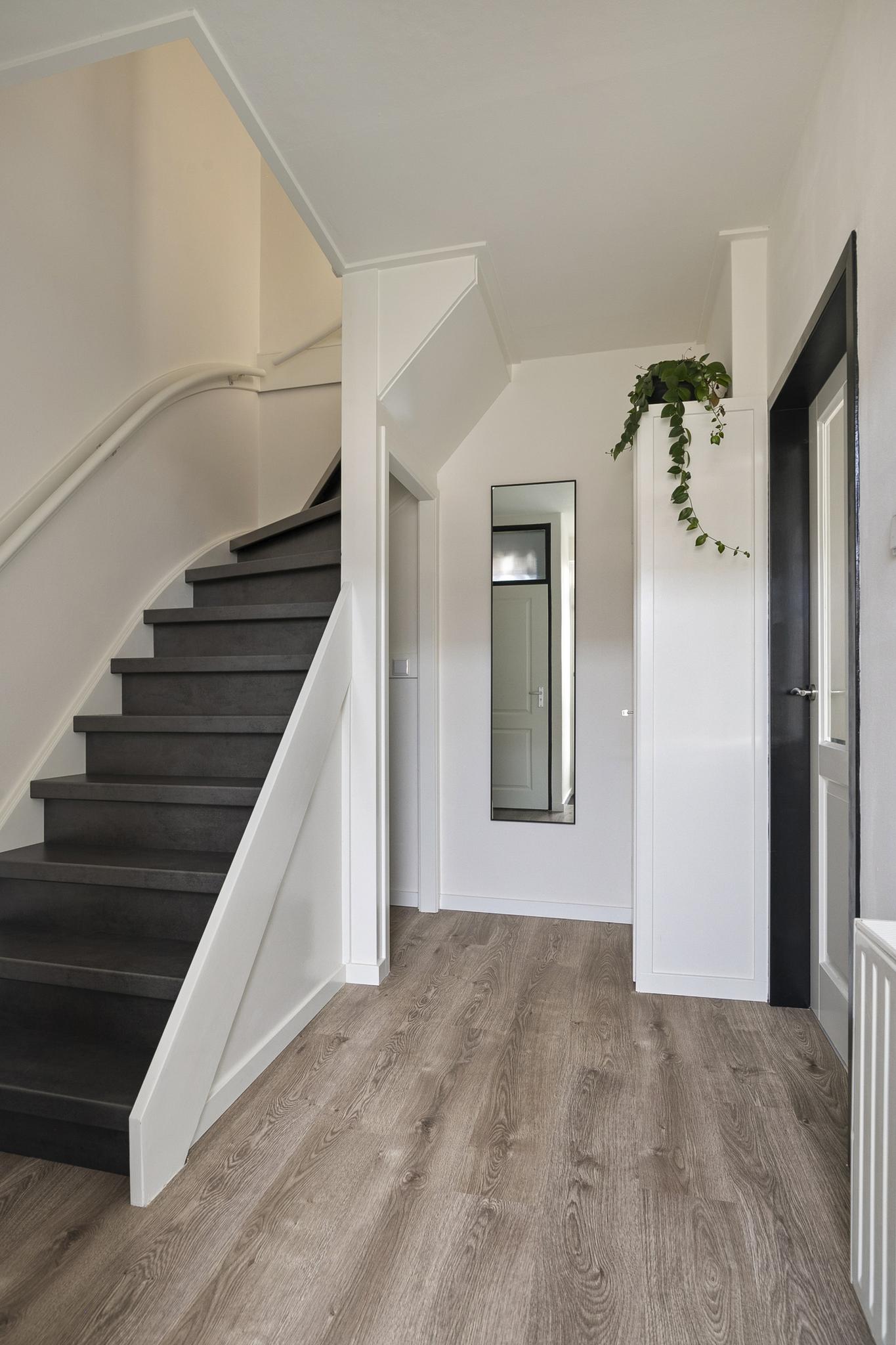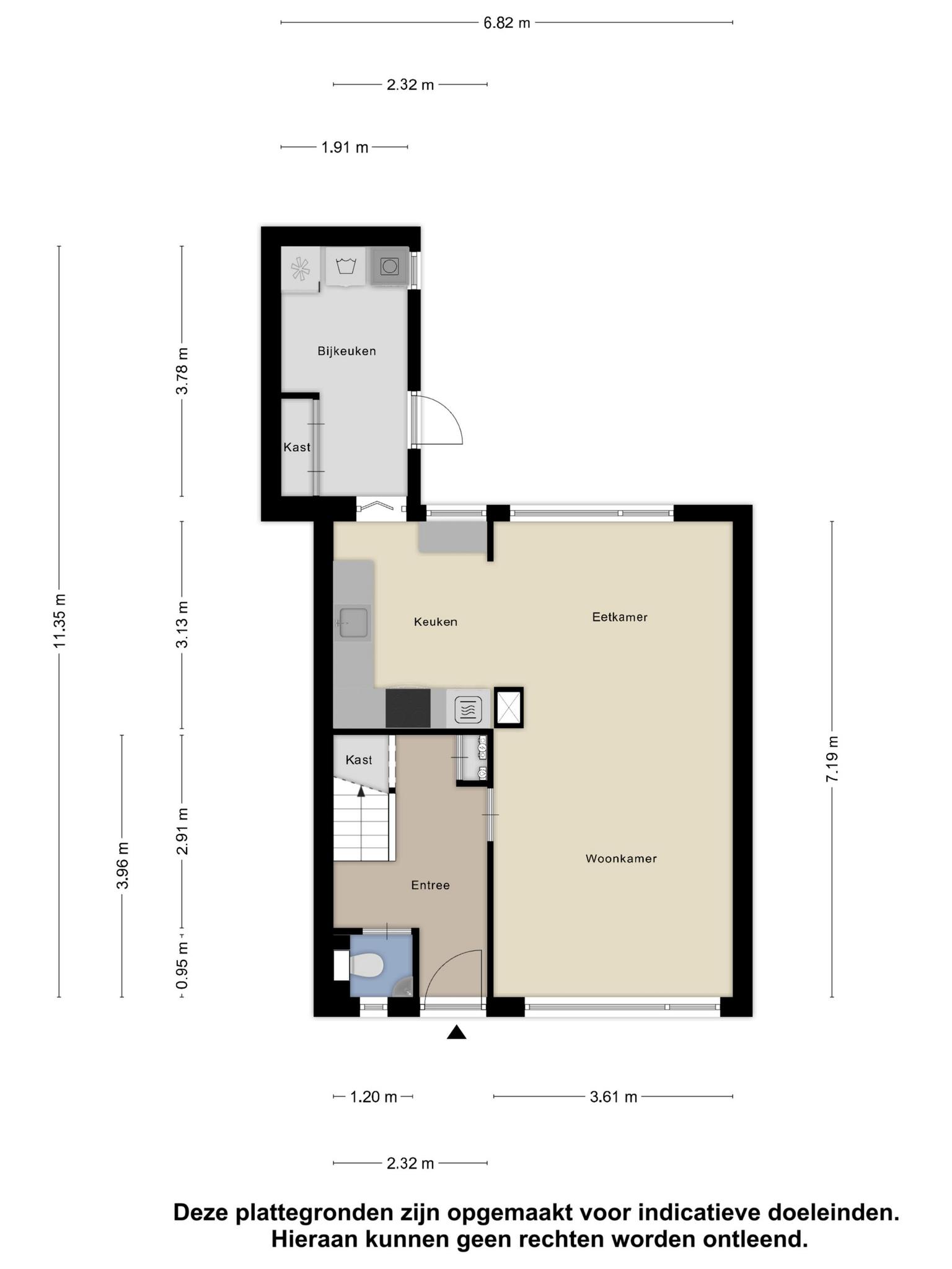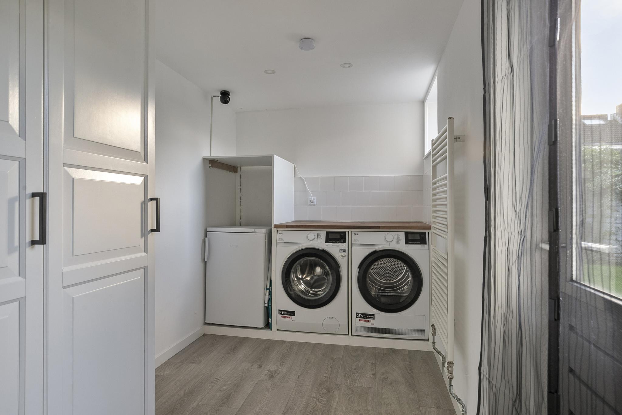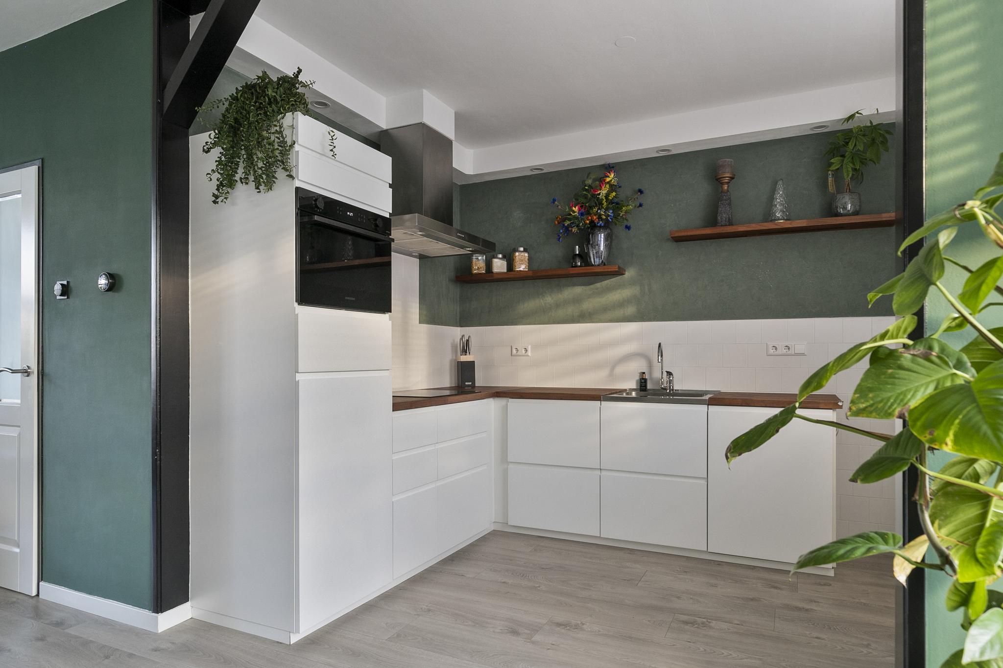 Entree met hal, meterkast en trapkast, modern toilet met fonteintje, lichte woonkamer met toegang tot halfopen keuken voorzien van diverse inbouwapparatuur, deur naar geïsoleerde bijkeuken met witgoedaansluitingen.