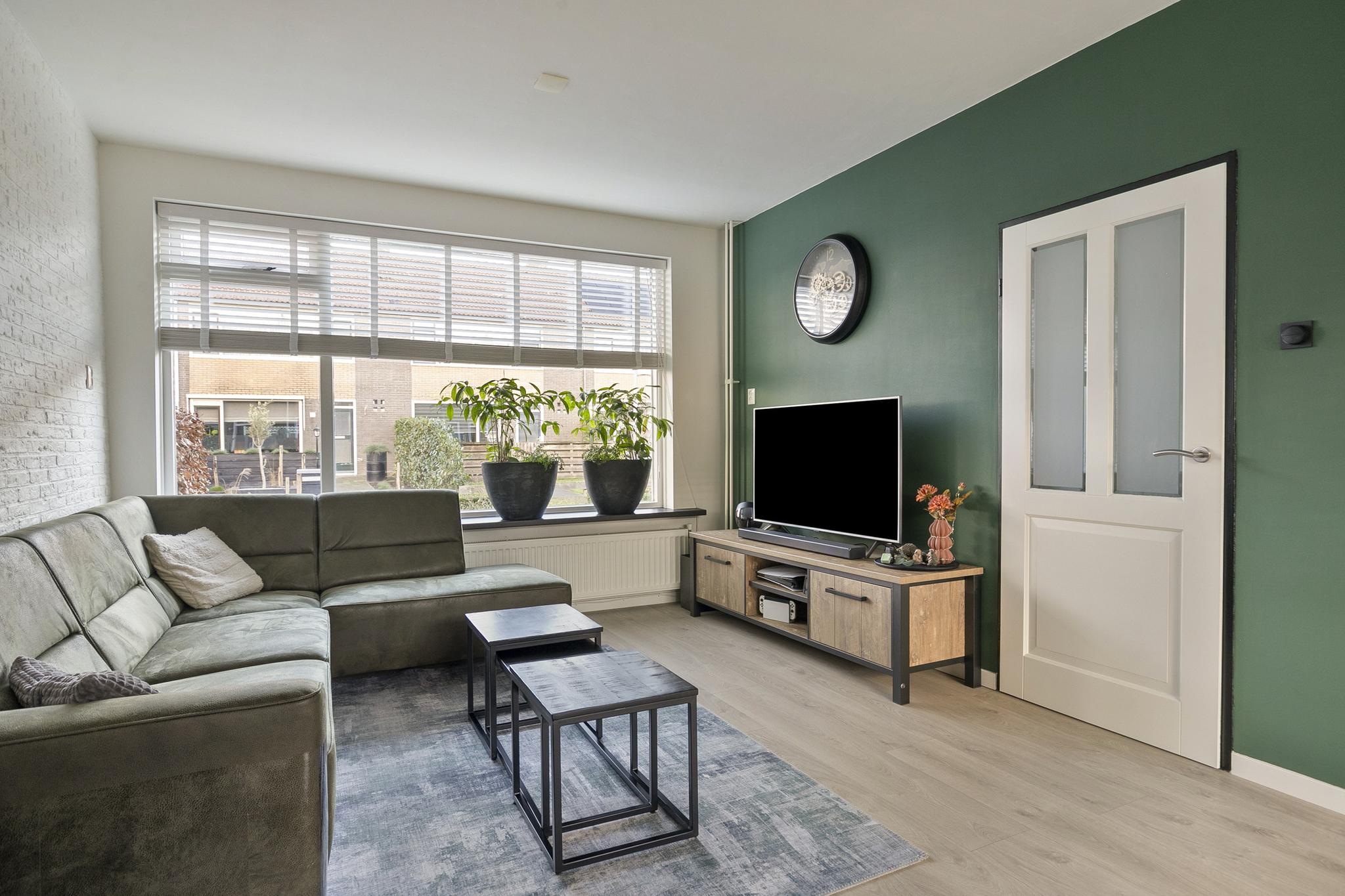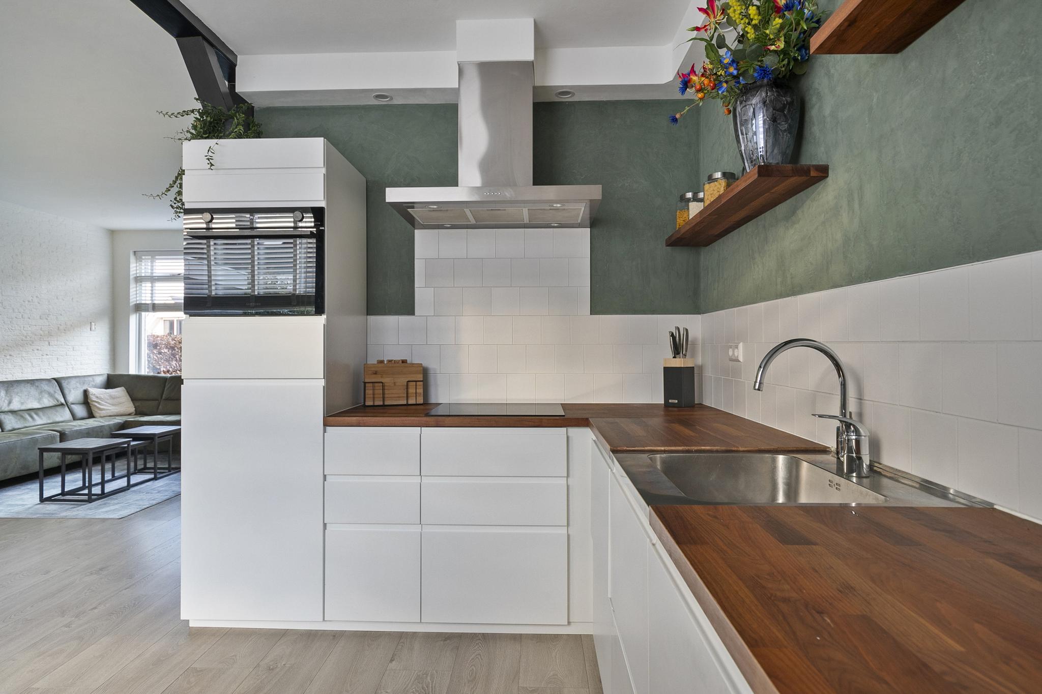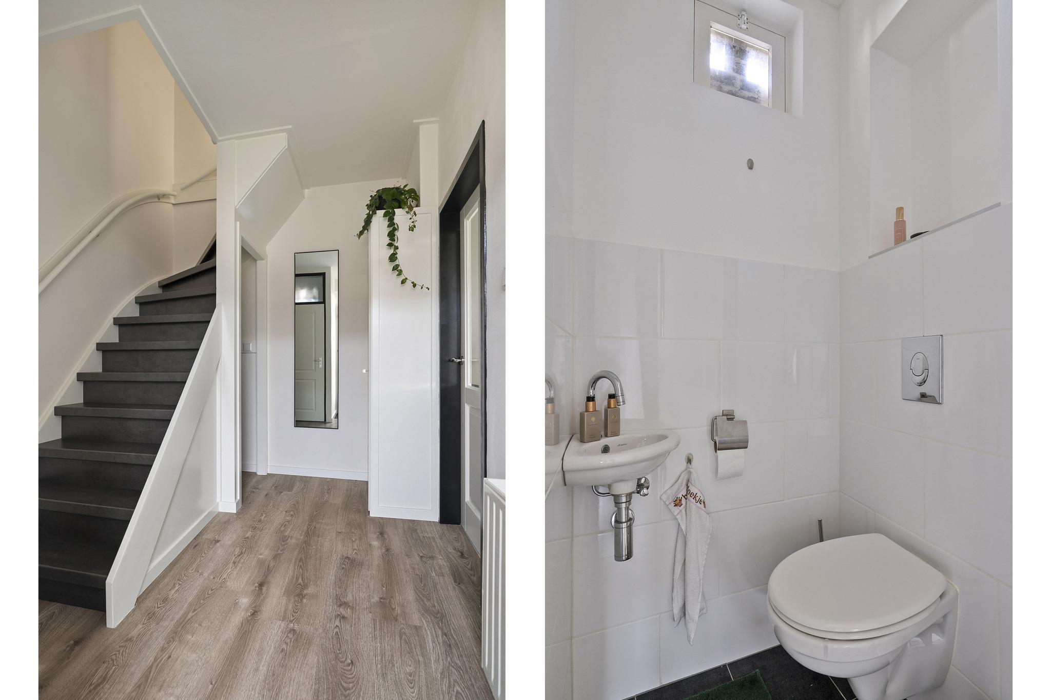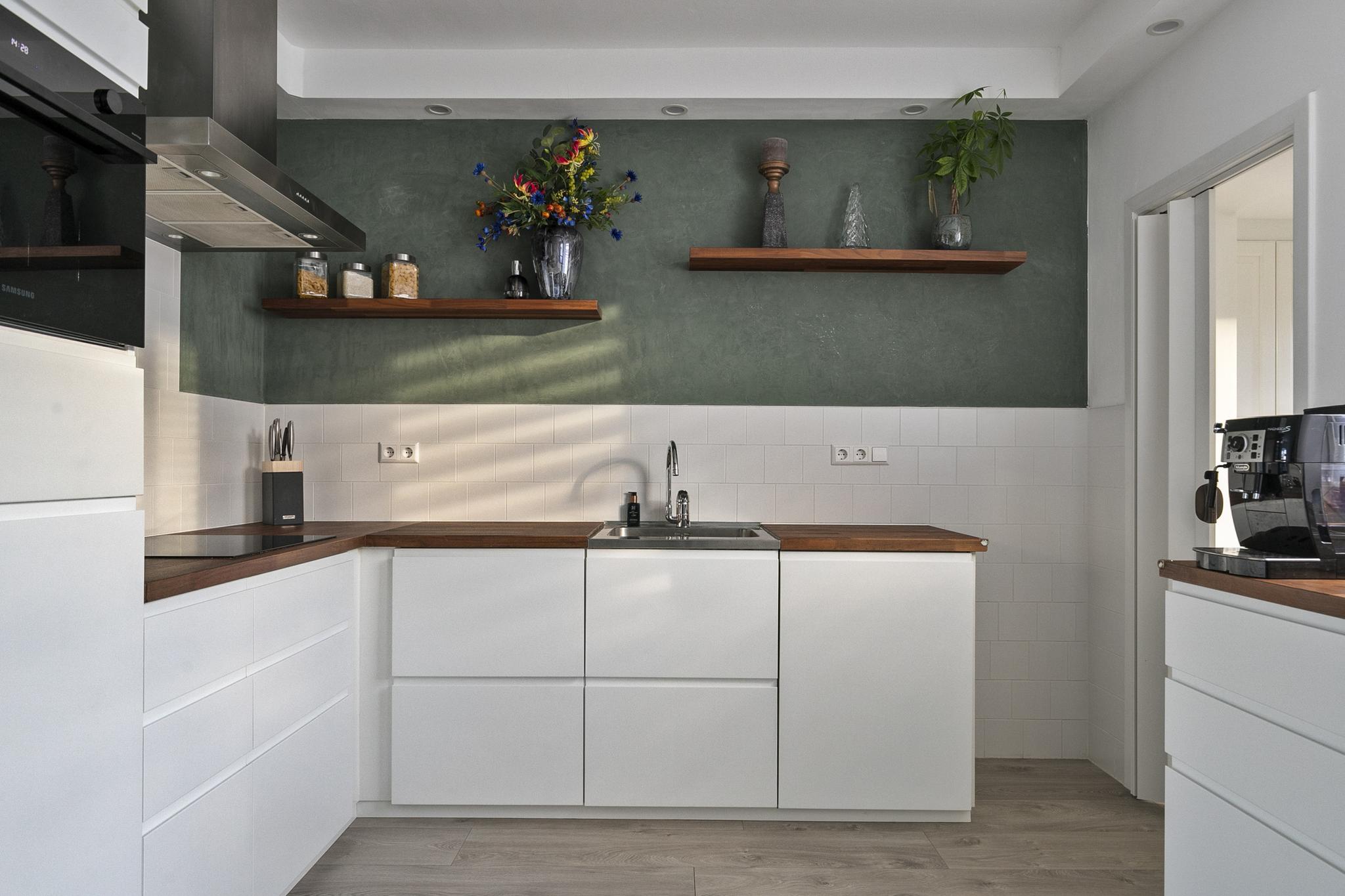 Entree met hal, meterkast en trapkast, modern toilet met fonteintje, lichte woonkamer met toegang tot halfopen keuken voorzien van diverse inbouwapparatuur, deur naar geïsoleerde bijkeuken met witgoedaansluitingen.