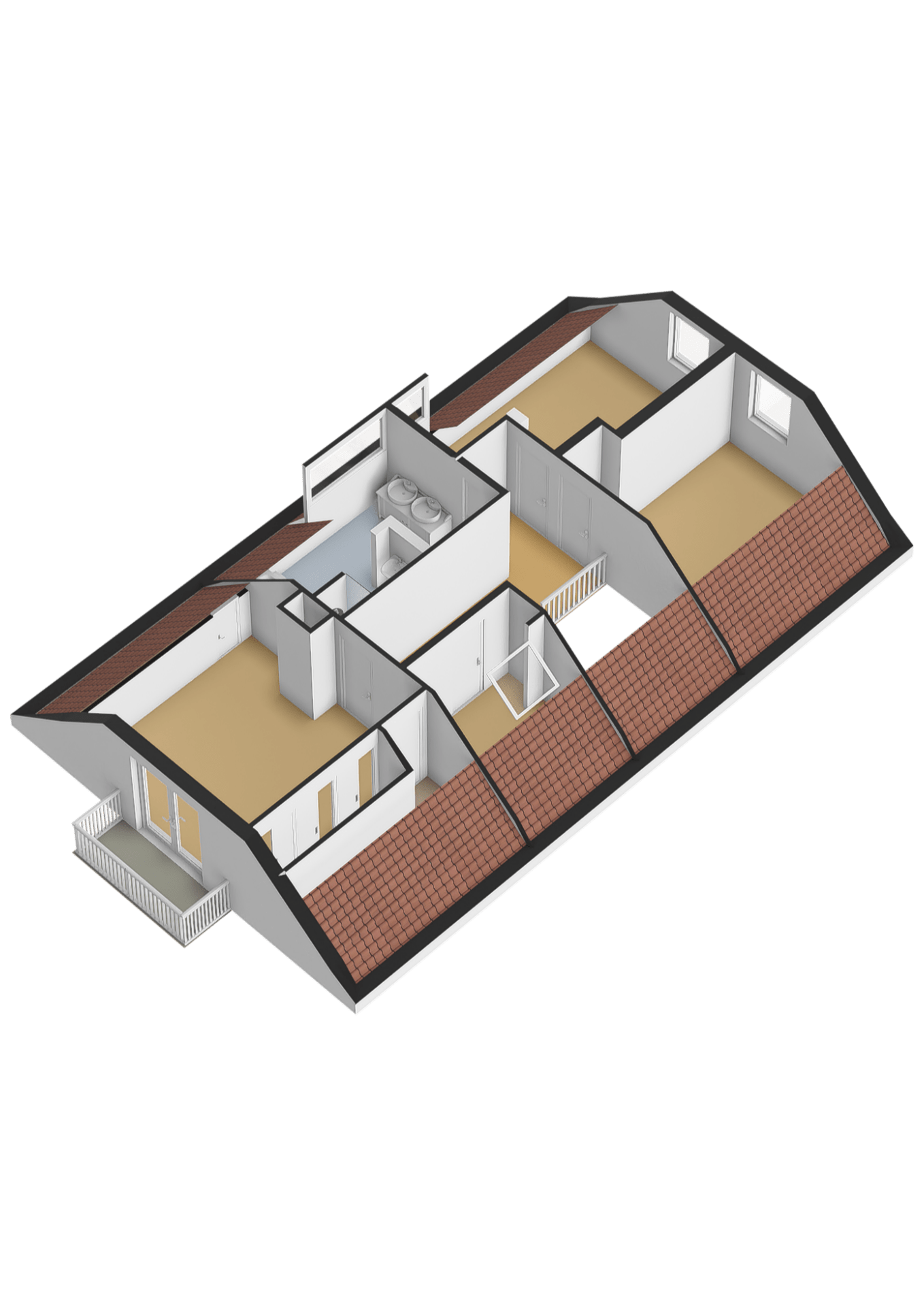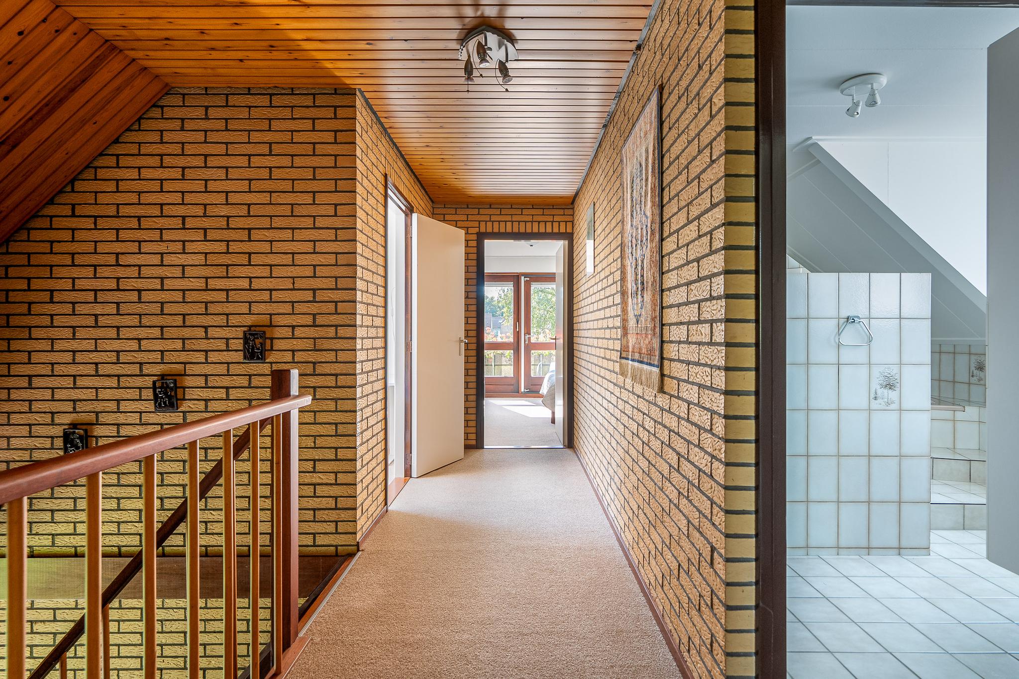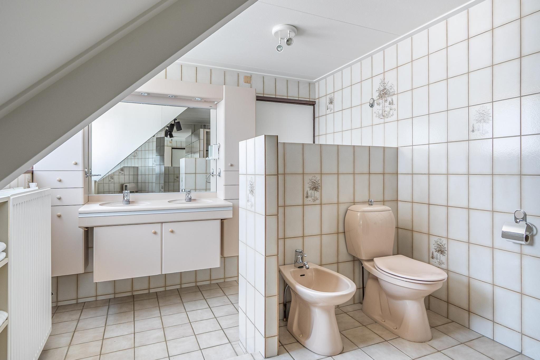 1e verdieping: bereikbaar via trap in de gang. Ruime verdieping met vide, vier slaapkamers van respectievelijk 6,5m2, 11m2, 14m² en 17m², de kleinste slaapkamer zou ook als kantoor kunnen worden gebruikt en de slaapkamer aan de voorzijde is voorzien van bergkast en balkon. Tweede badkamer voorzien van toilet, bidet, ligbad, douche en dubbele wastafel.