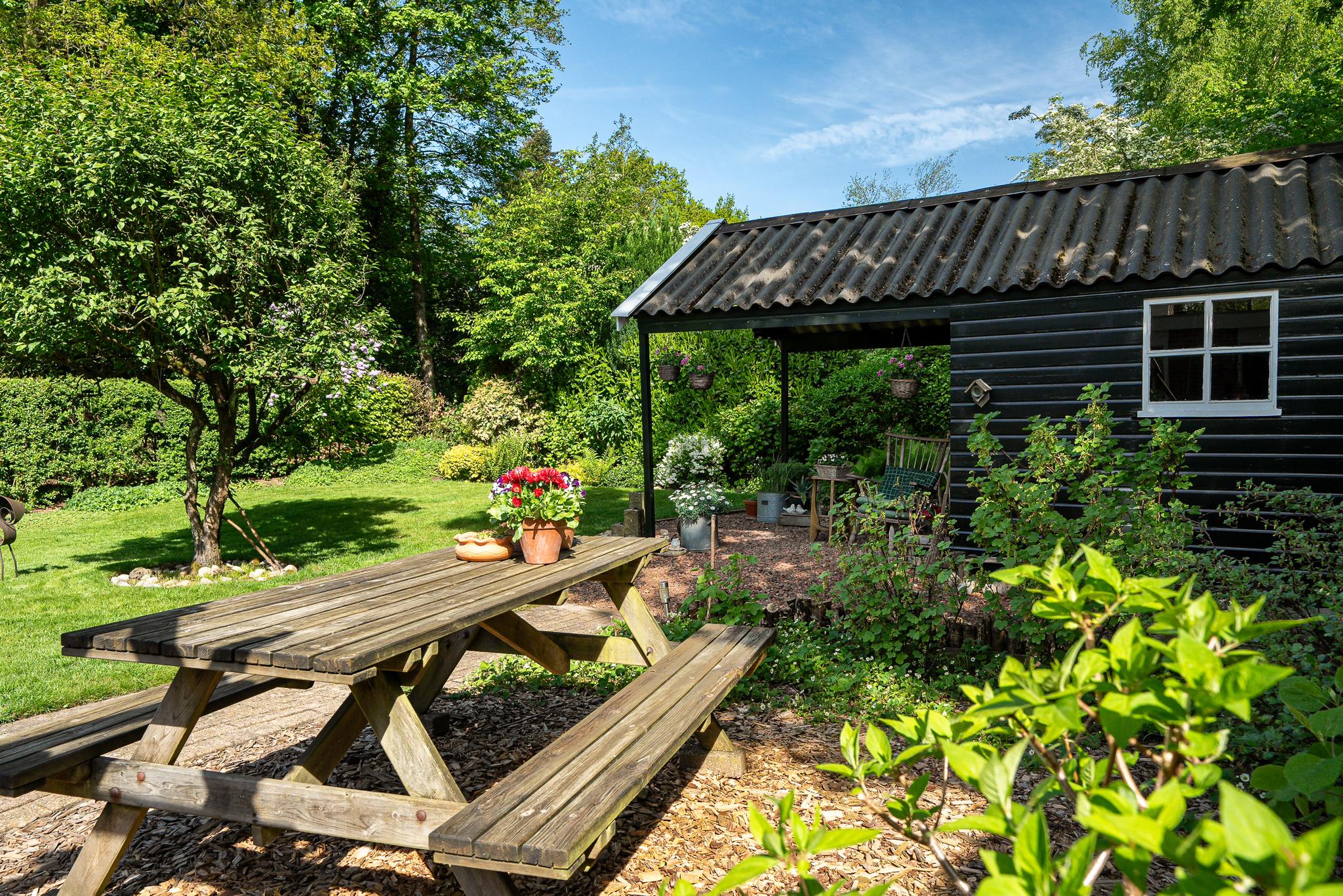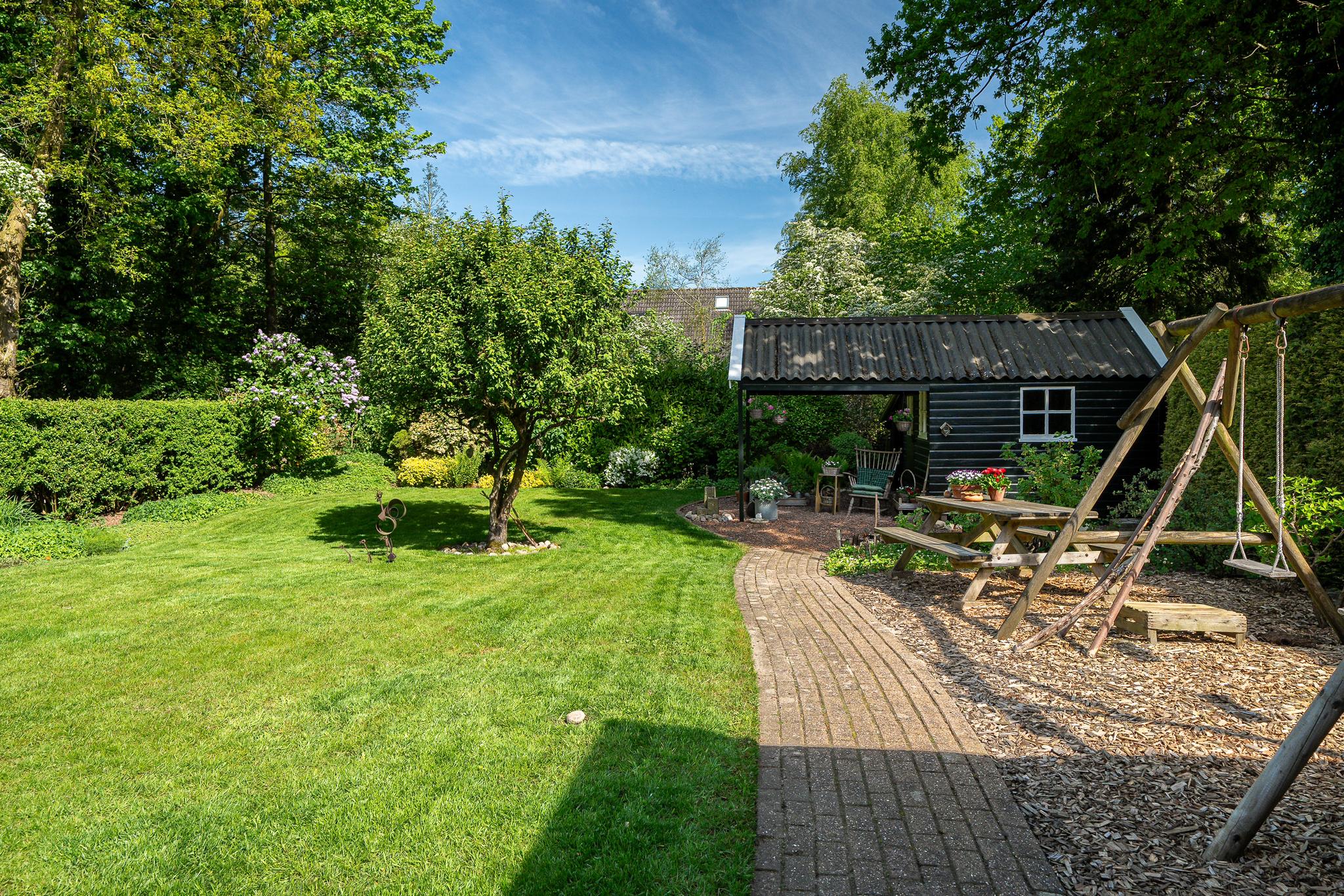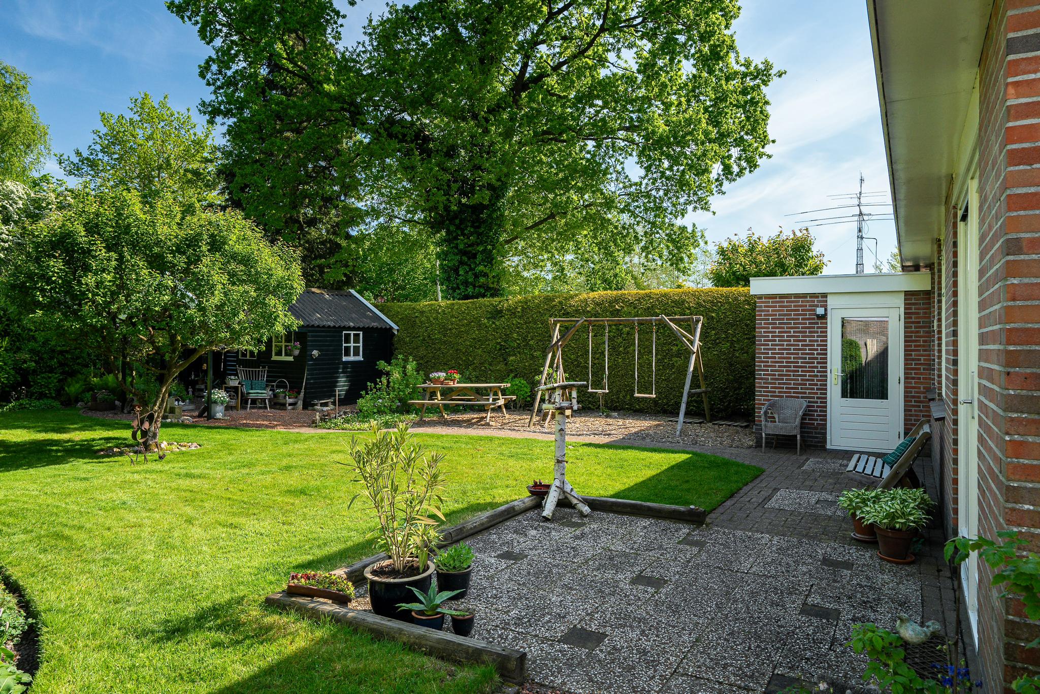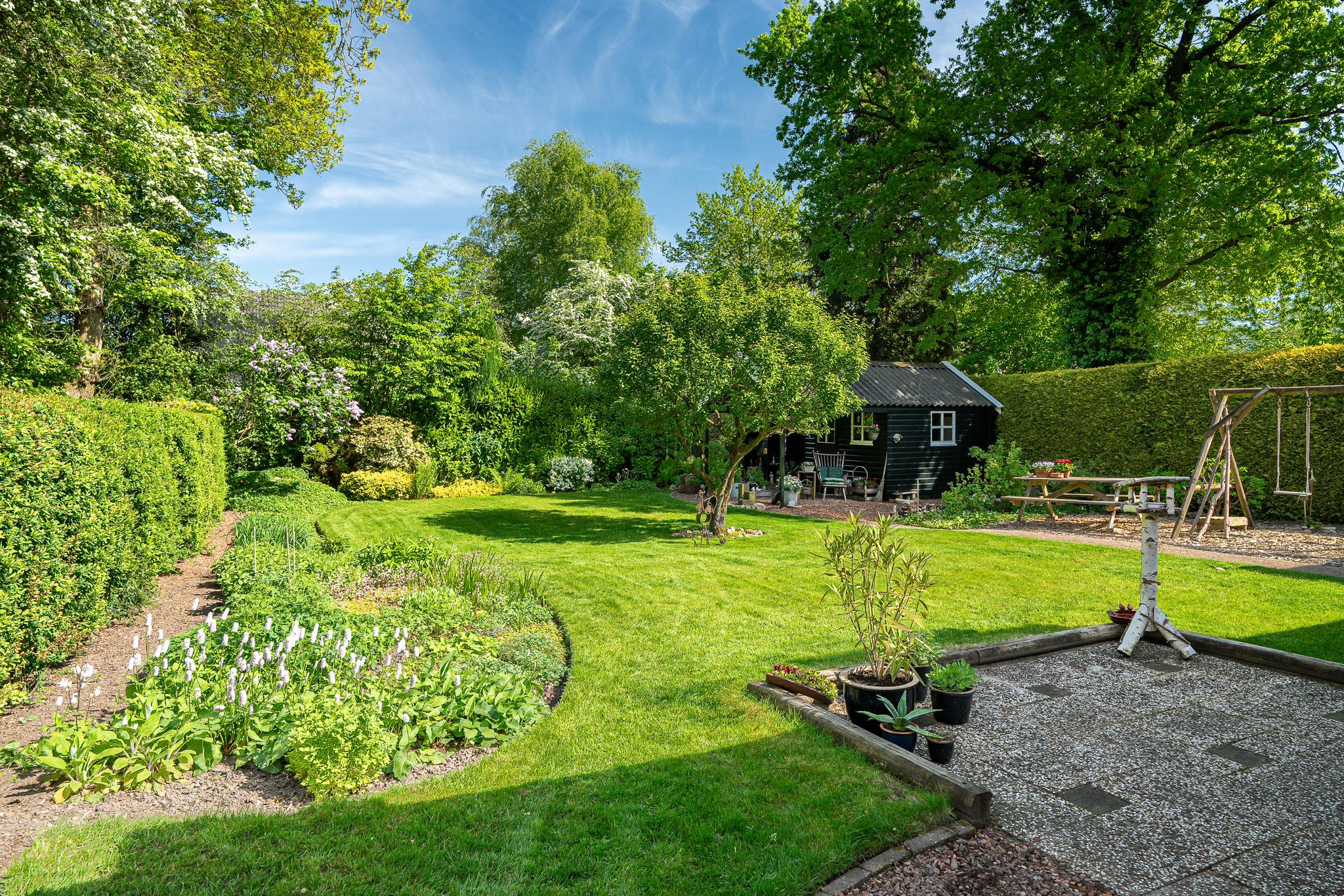 Wat deze woning extra bijzonder maakt, is het ruime perceel van 727 m². De fraai aangelegde achtertuin, gelegen op het noordoosten, biedt door zijn grootte volop zon en privacy. Hier heeft u alle ruimte voor een groot terras, een speelplek voor kinderen of een moestuin. Ook is er een tuinhuis met overkapping. Aan de voorzijde van de woning bevindt zich een ruime oprit met parkeergelegenheid voor meerdere auto’s.