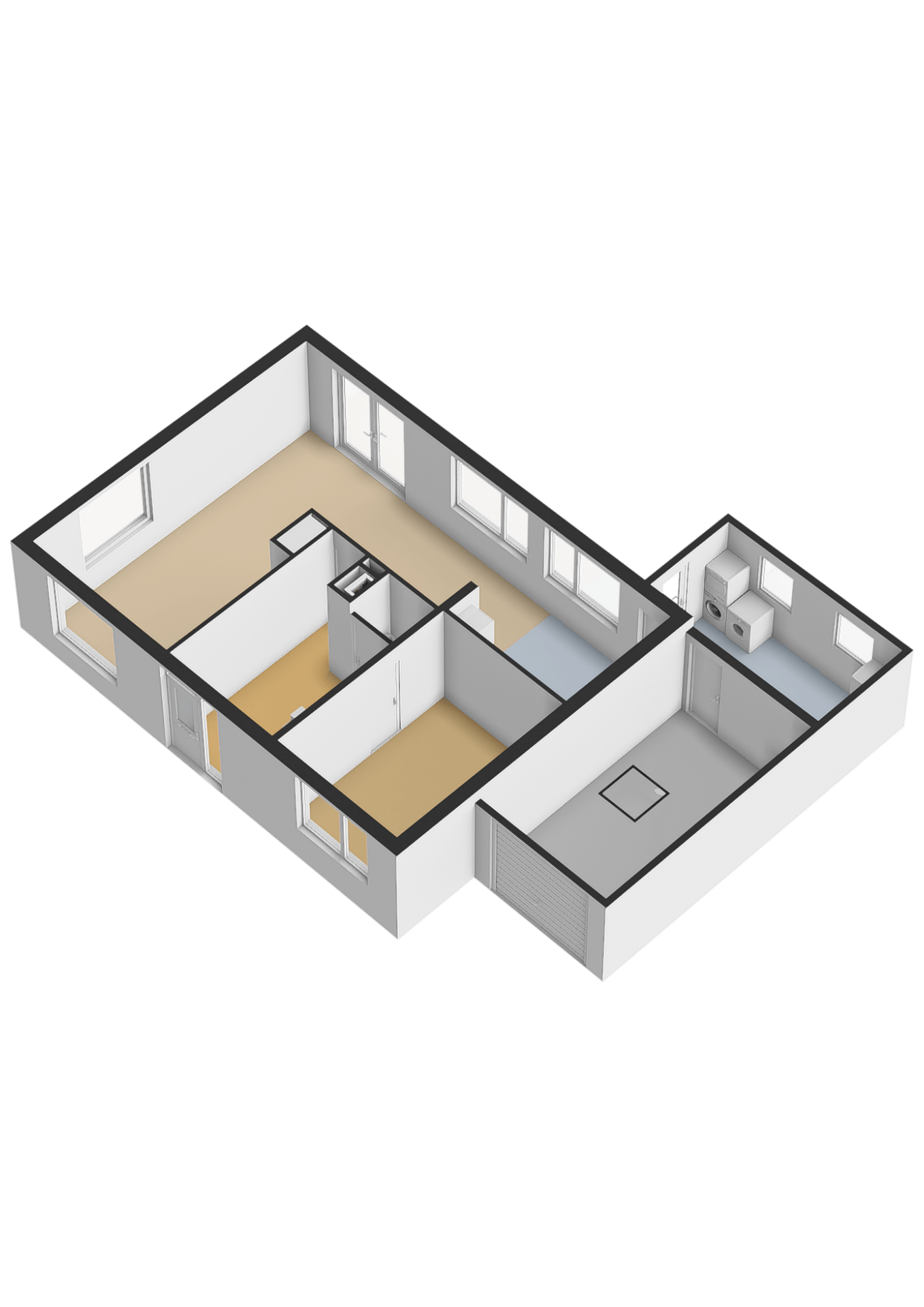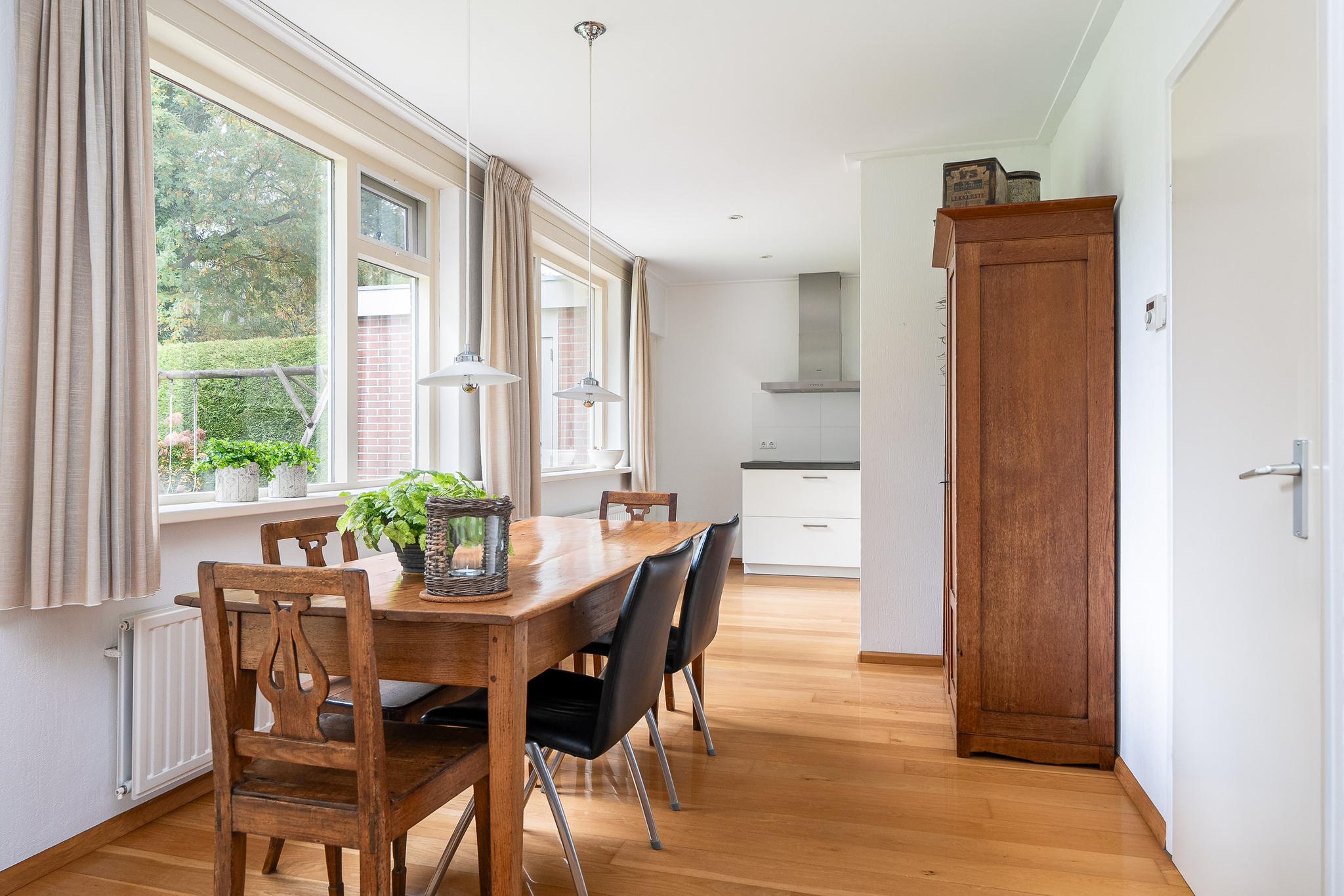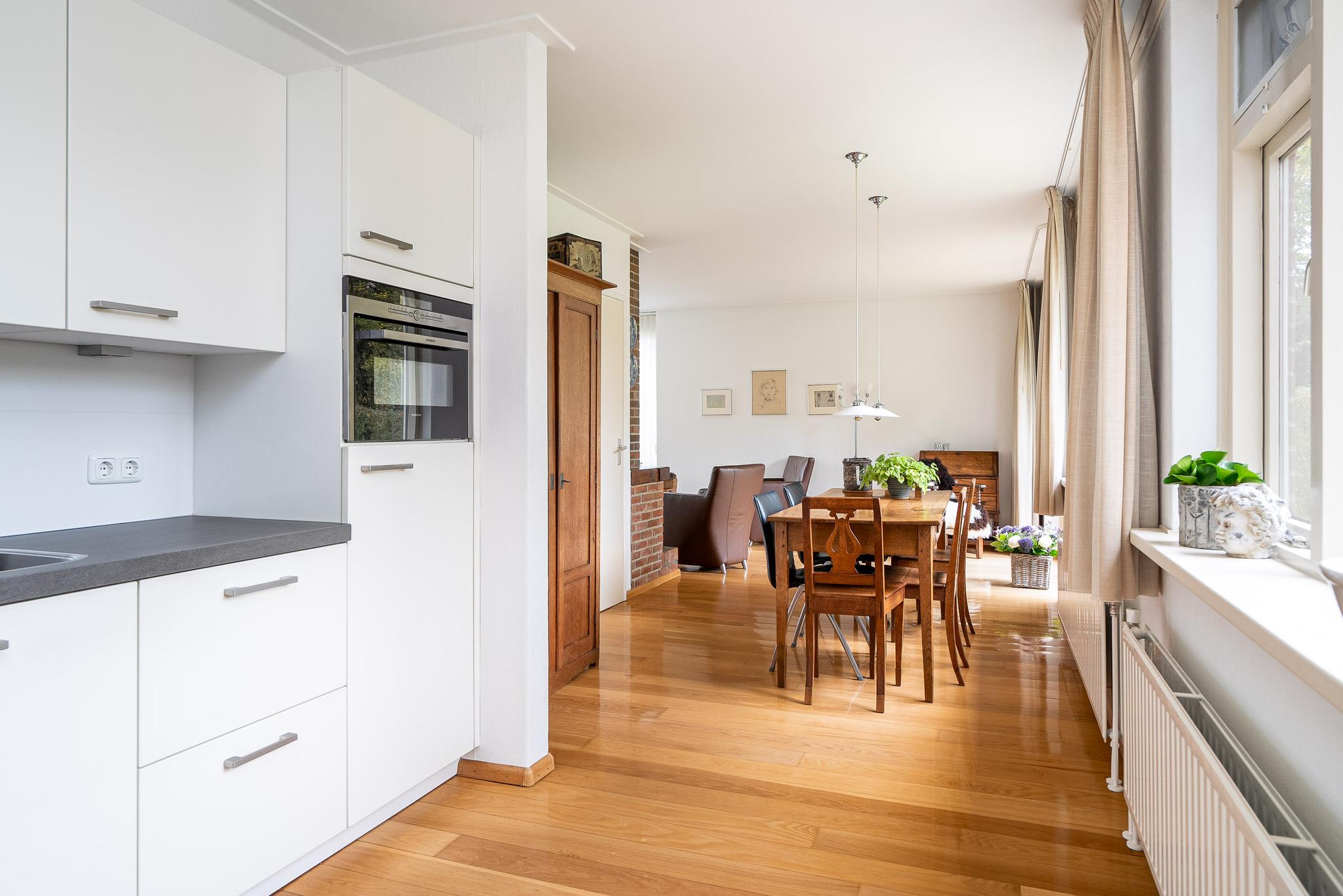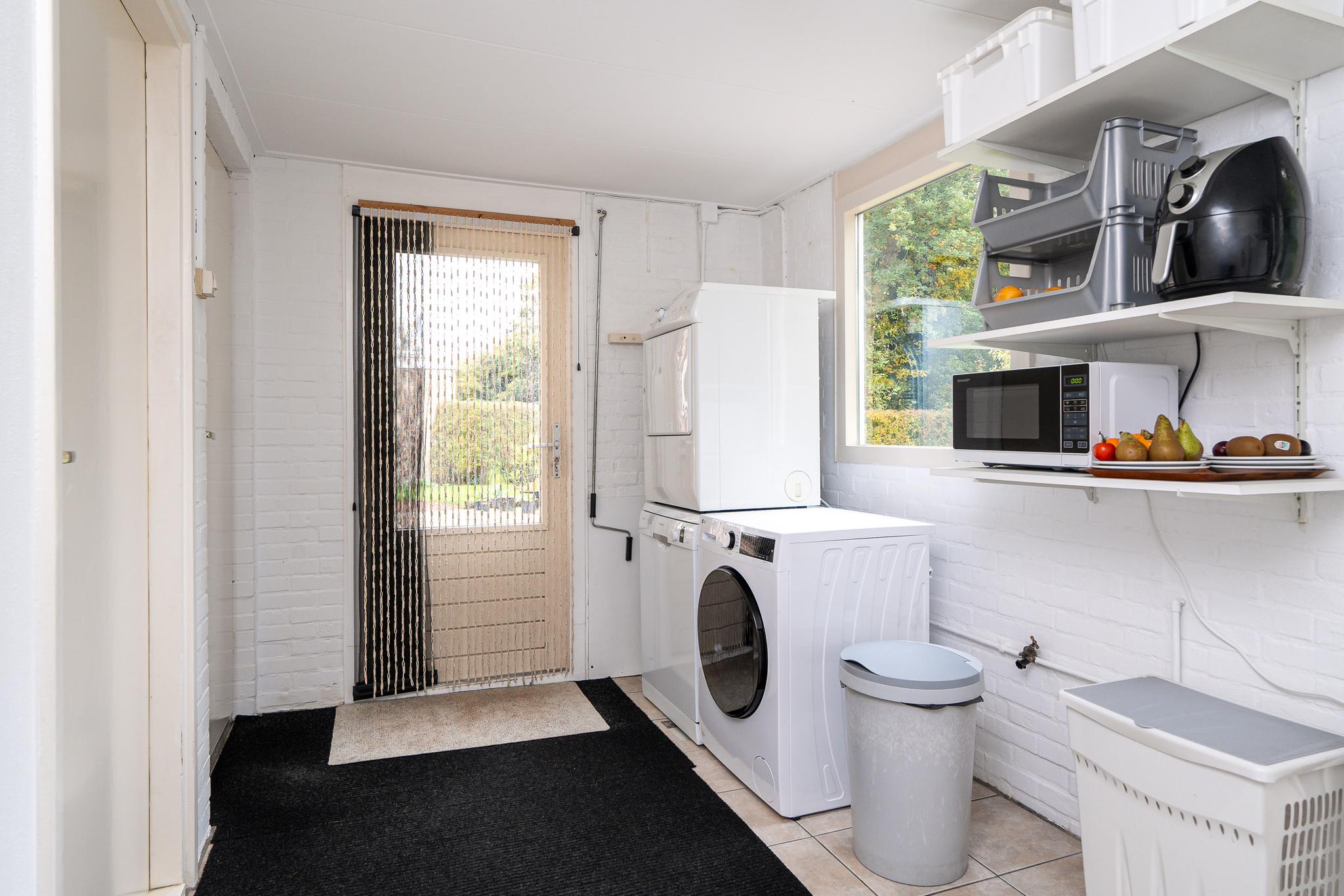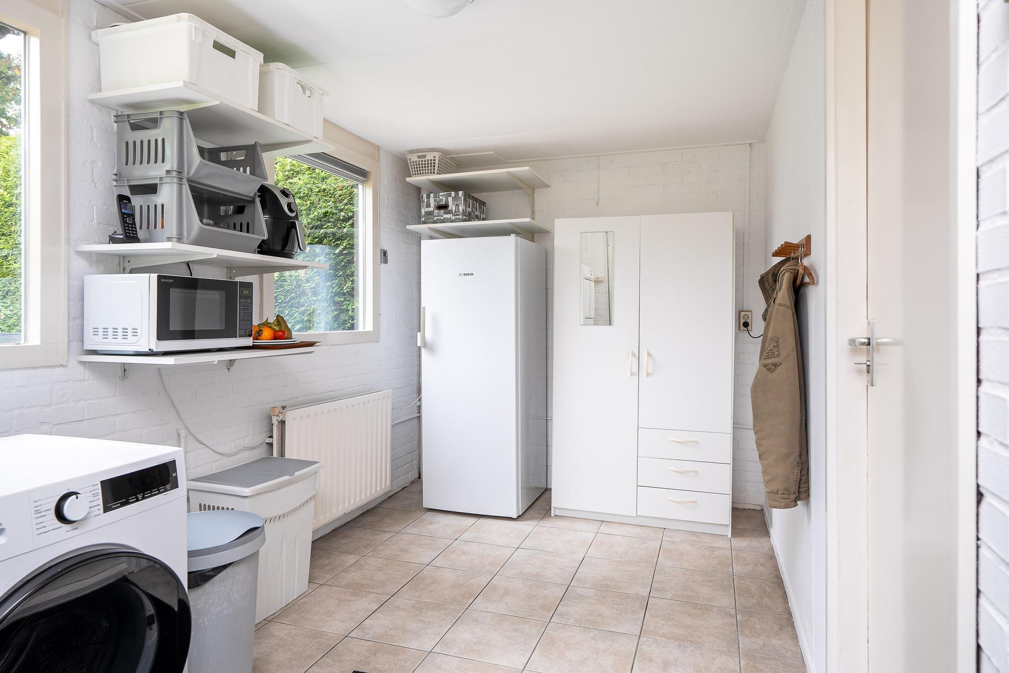 De open keuken is uitgerust met Siemens inbouwapparatuur, waaronder een oven, inductiekookplaat, afzuigkap en koeler. Dankzij de open opstelling staat u tijdens het koken in direct contact met de rest van de leefruimte. Aangrenzend bevindt zich de bijkeuken, die extra opbergruimte biedt en directe toegang geeft tot de grote achtertuin en de aangebouwde stenen garage. De garage is ruim genoeg voor een auto en extra opslag.