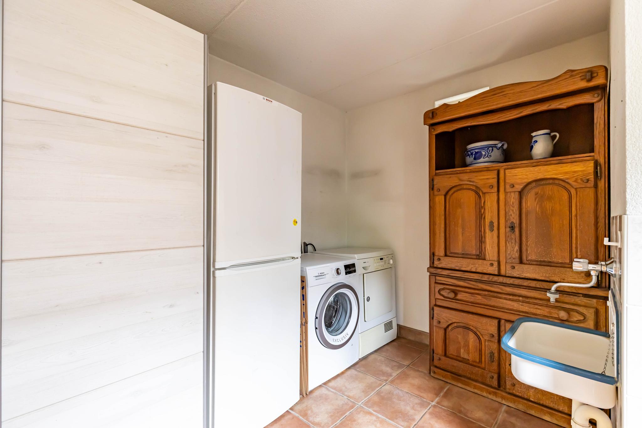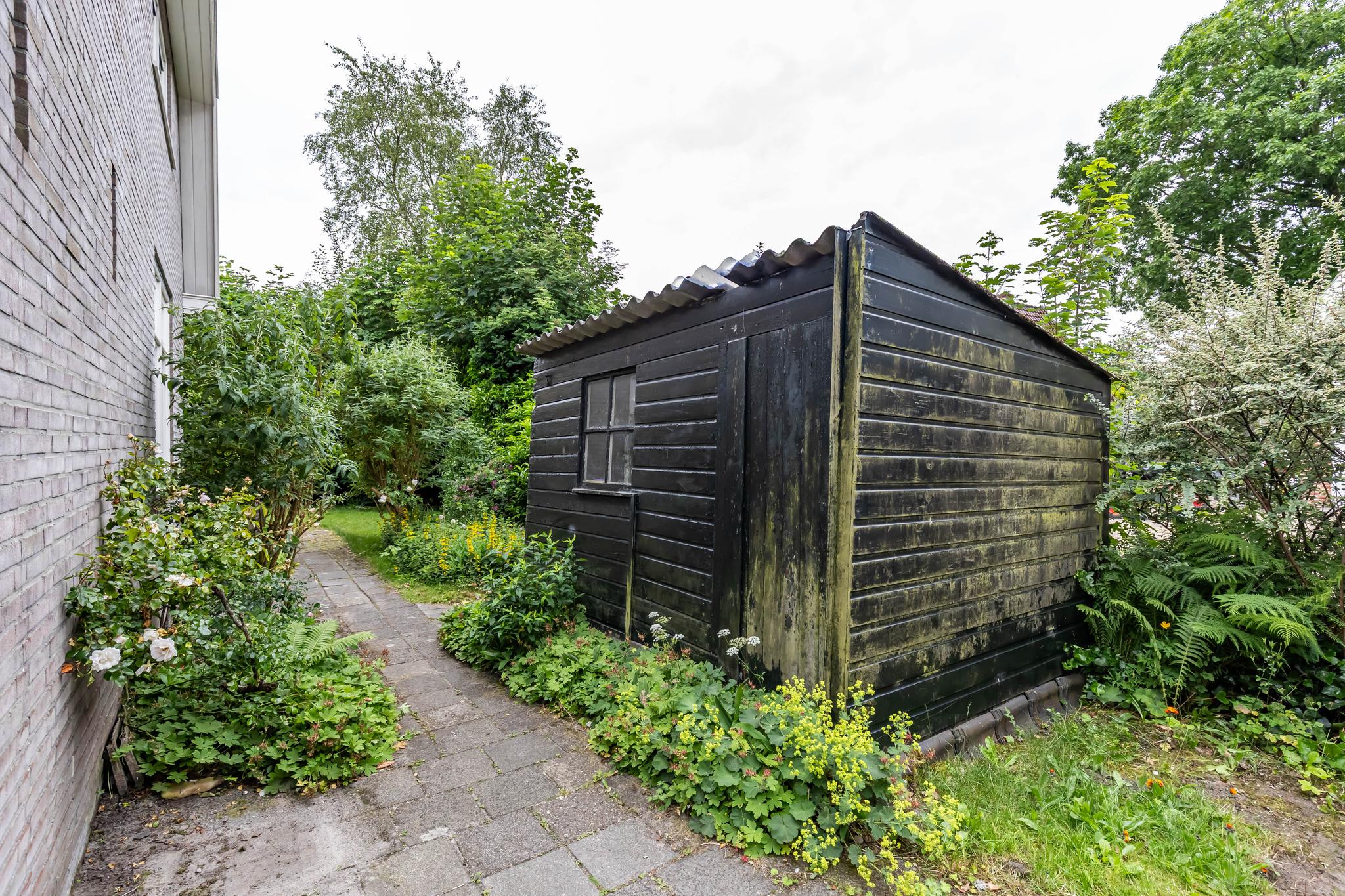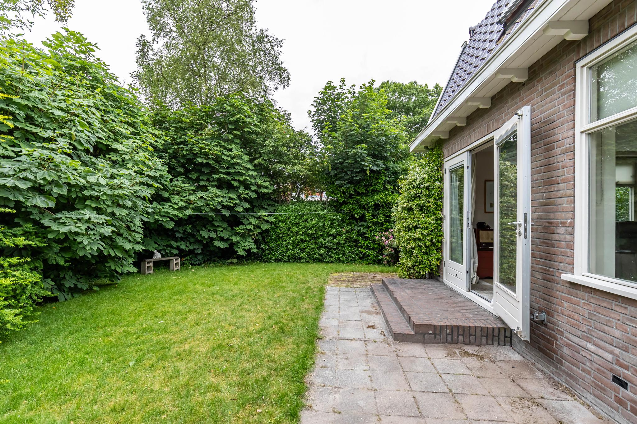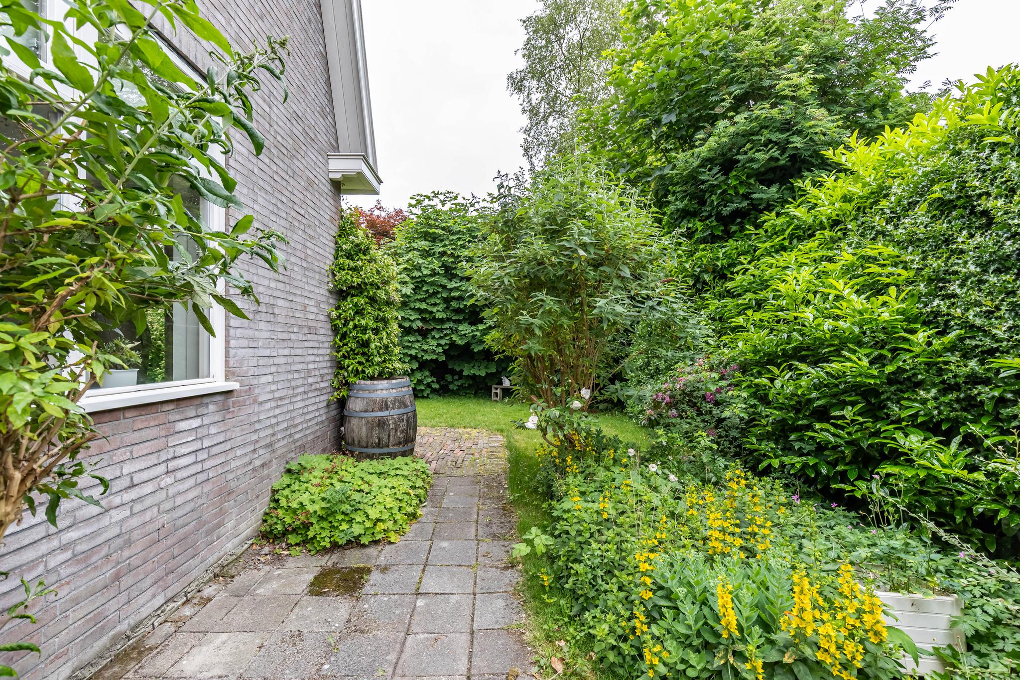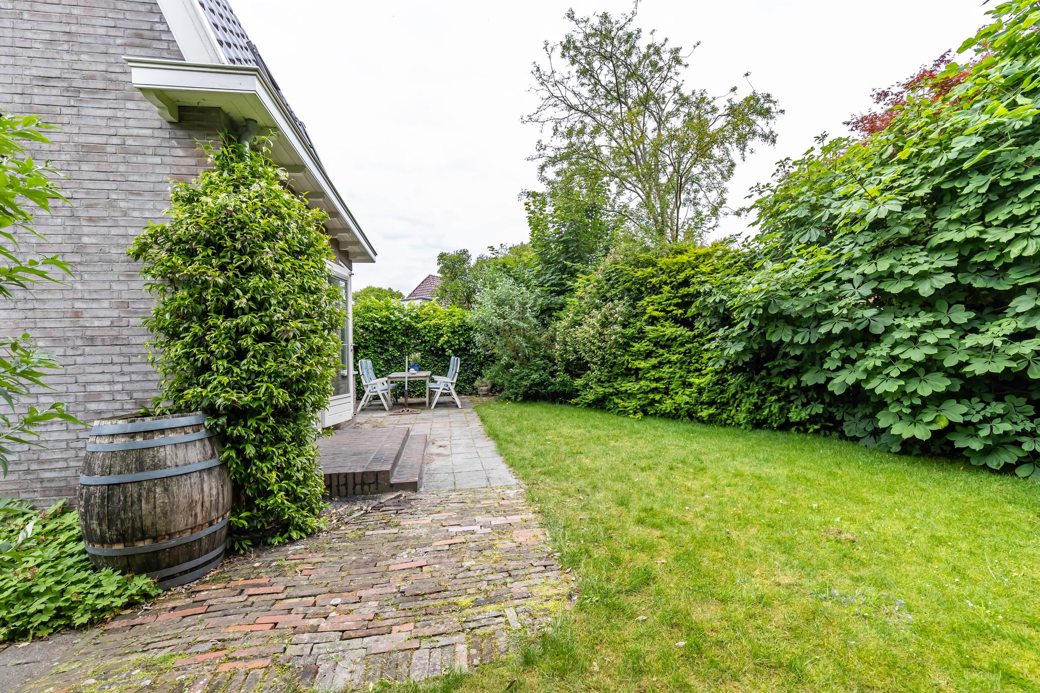 De groene tuin ligt rondom de woning en biedt veel privacy. De achtertuin heeft meerdere terrassen en grenst aan de vrijstaande stenen garage. De brede oprit biedt plaats aan meerdere auto’s.