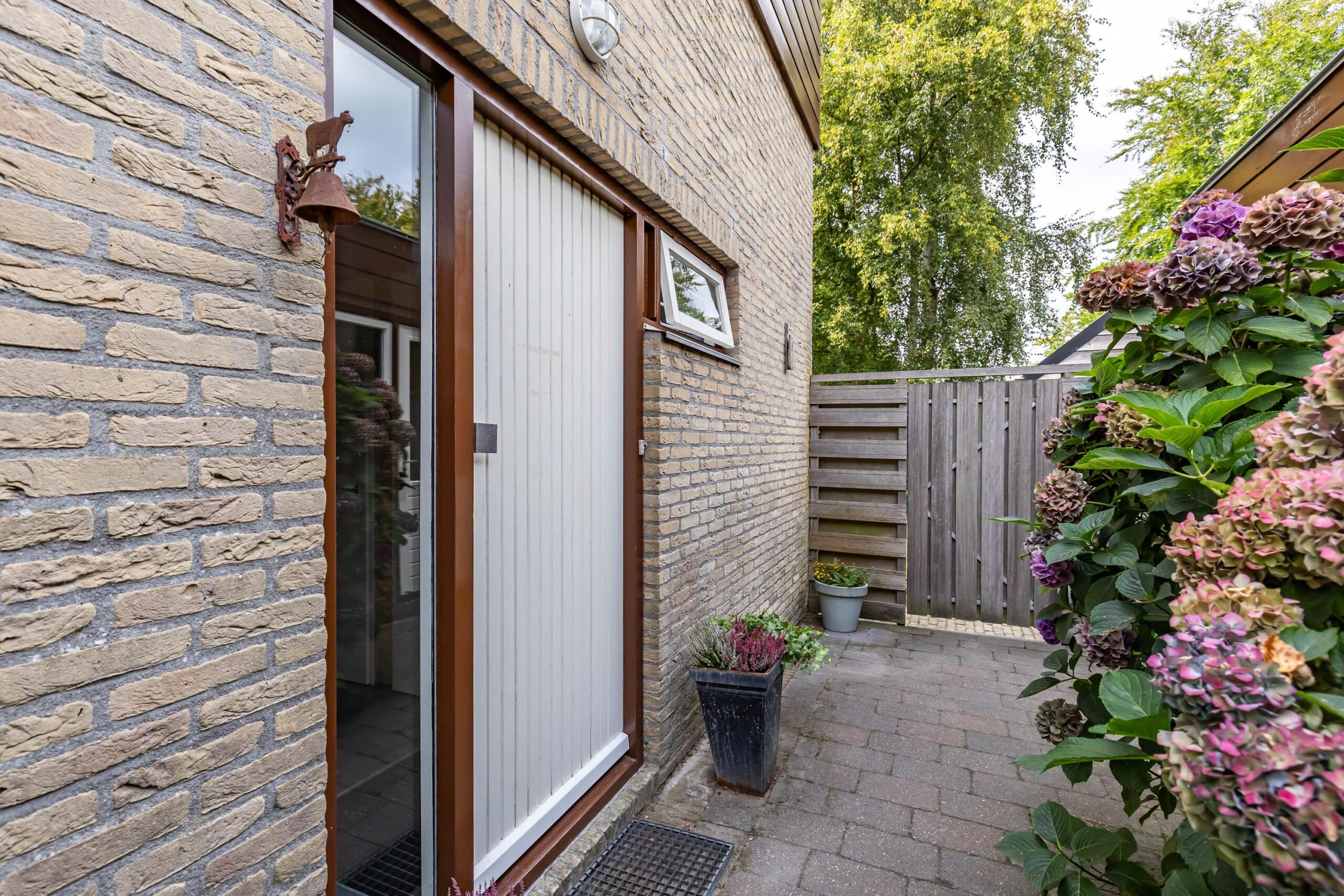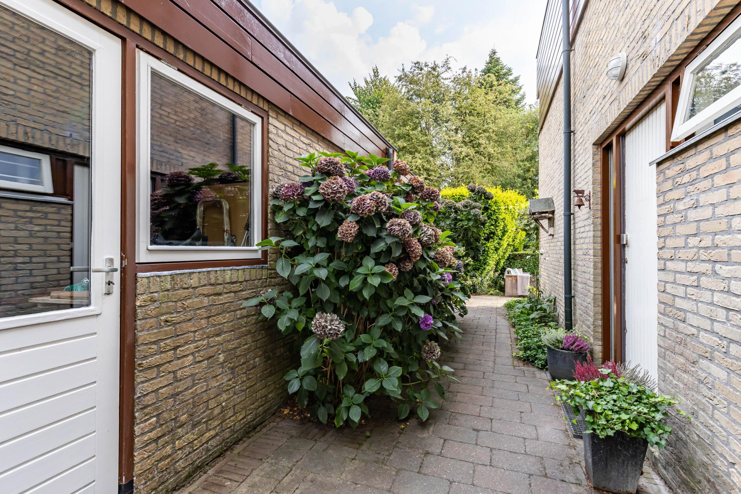 De tuin ligt rondom de woning en is ingericht met bestrating, beplanting en meerdere zitplekken. Er is een houten schuur met overkapping. Tevens is er een vrijstaande stenen garage met carport. De oprit biedt parkeerruimte voor meerdere auto’s.