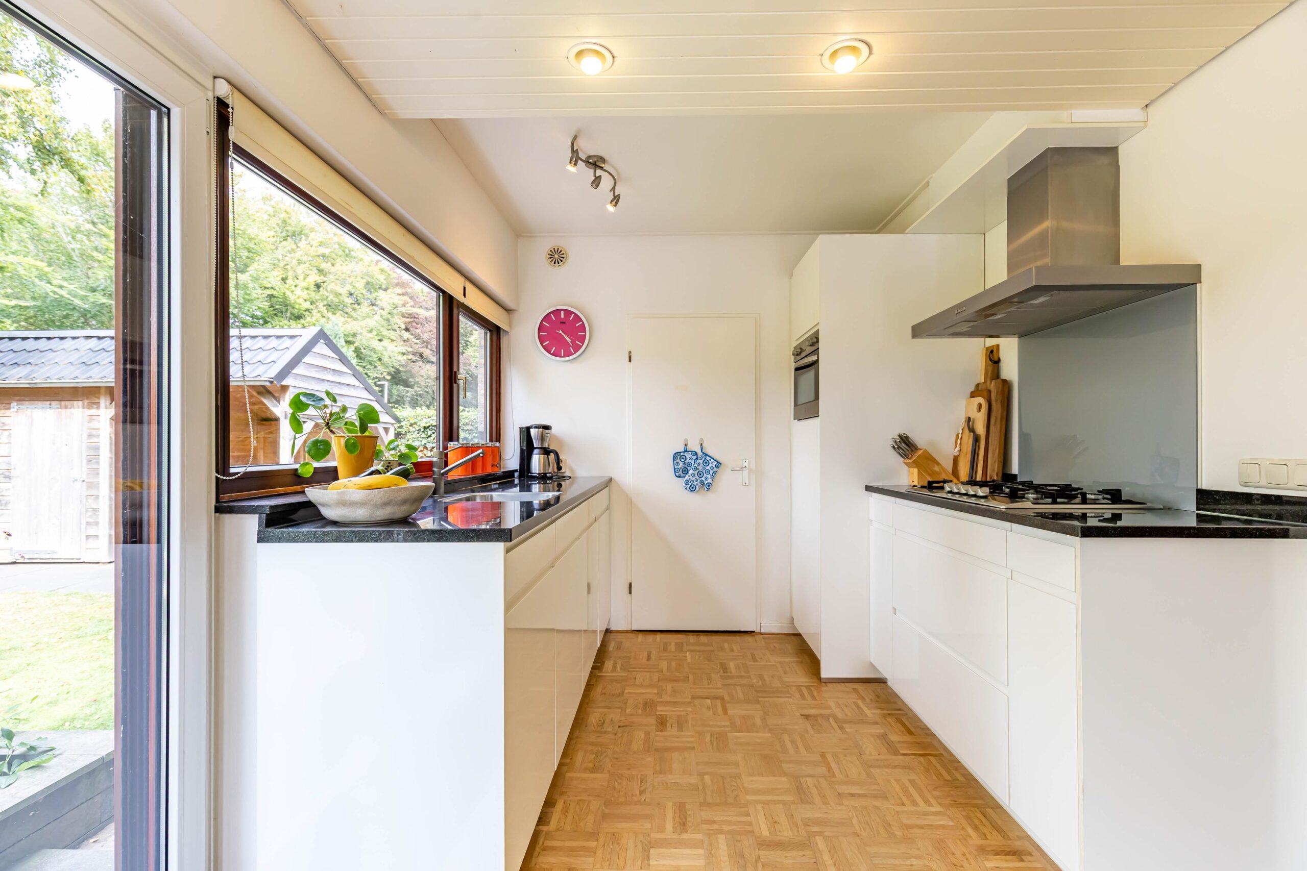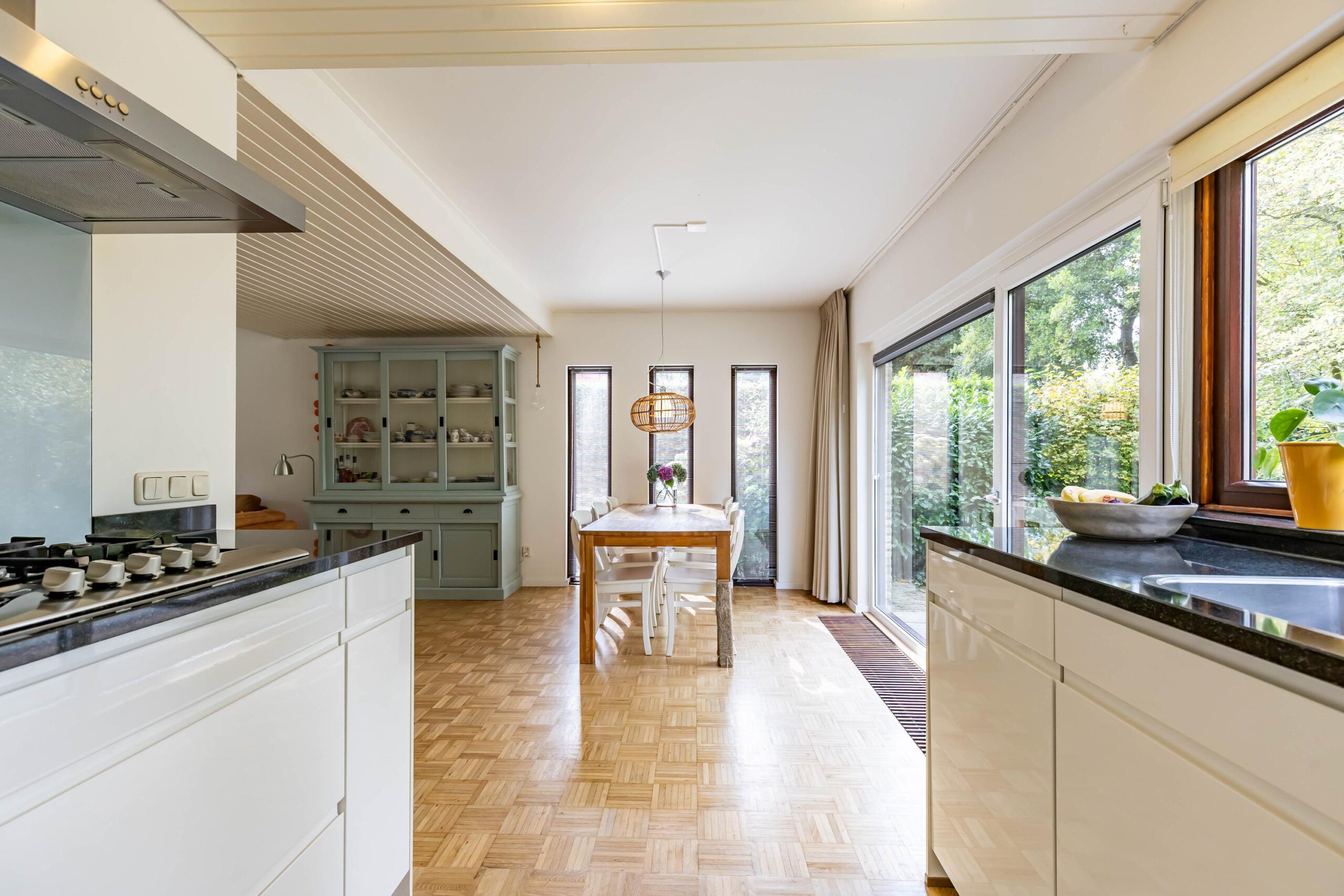 Via de entree kom je binnen in de hal met trapopgang en modern toilet. Vanuit de hal stap je de L-vormige woonkamer binnen, met een oppervlakte van circa 44 m². Grote raampartijen zorgen voor veel daglicht en de schuifpui geeft direct toegang tot de tuin. Aansluitend bevindt zich de eetkamer, die door de open indeling in verbinding staat met de woonkamer. De halfopen keuken is strak uitgevoerd, voorzien van inbouwapparatuur en heeft zicht op de achtertuin. Toegang naar bergruimte met wasmachine aansluiting.