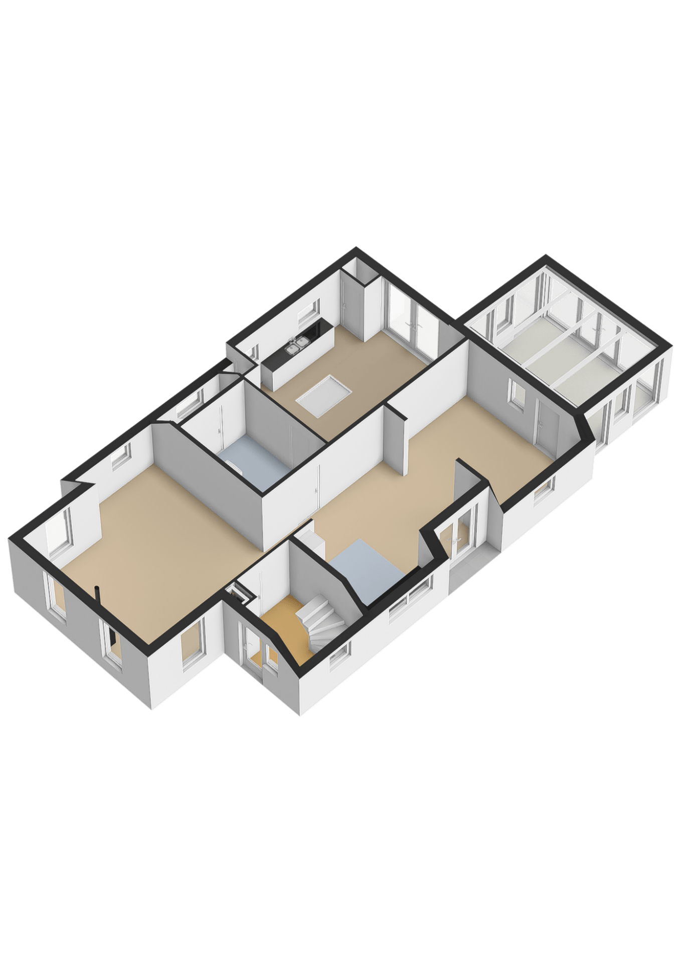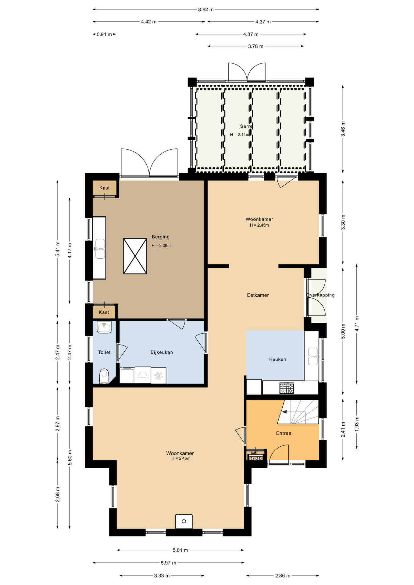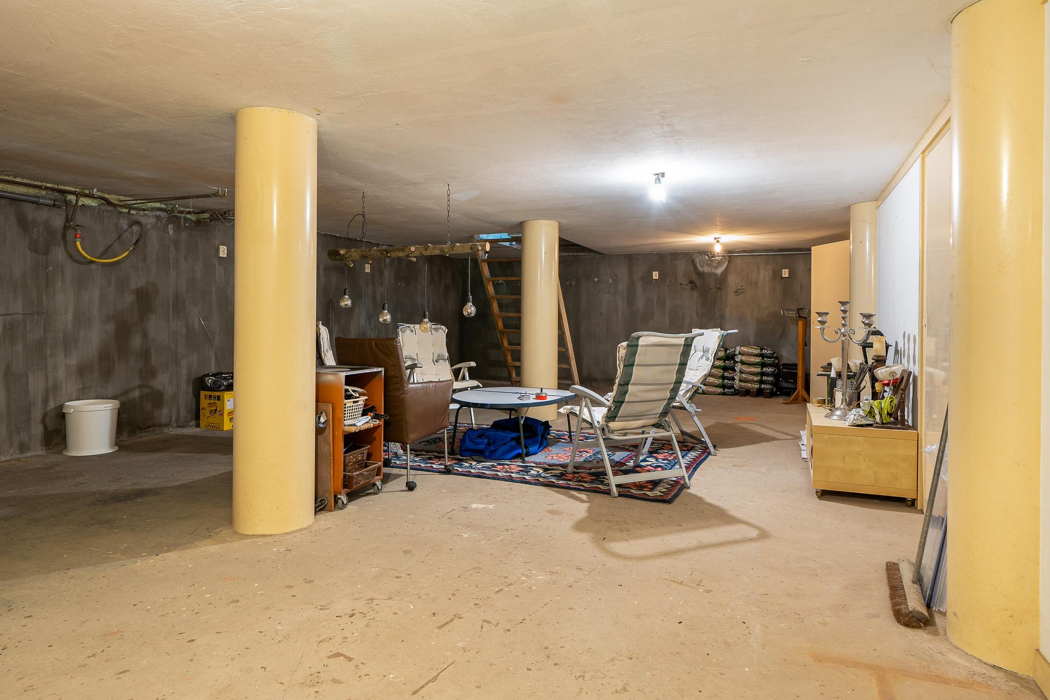 Begane grond: Entree/hal, ruime woonkamer aan voorzijde voorzien van palletkachel, open woonkeuken met diverse inbouwapparatuur. Aan de achterzijde van de woning is een tweede woonkamer gerealiseerd welke teven toegang biedt tot de aangebouwde serre. Vanuit de keuken is de bijkeuken met toilet toegankelijk. De inpandige garage/berging is voorzien van betonvloer en biedt toegang tot de uiterst ruime kelder met stahoogte welke onder de volledige begane grond is realiseert.