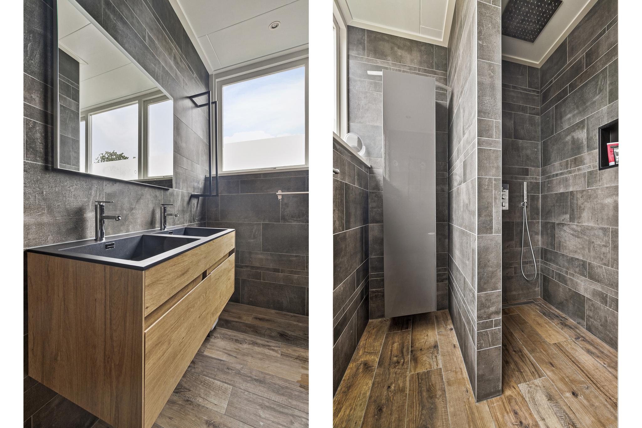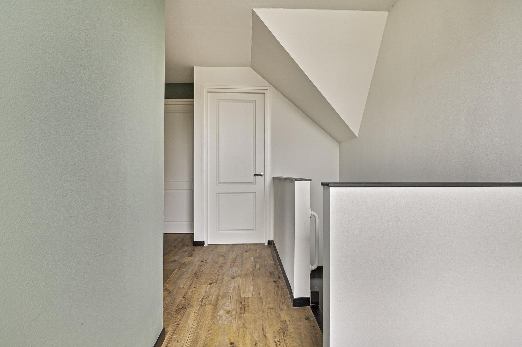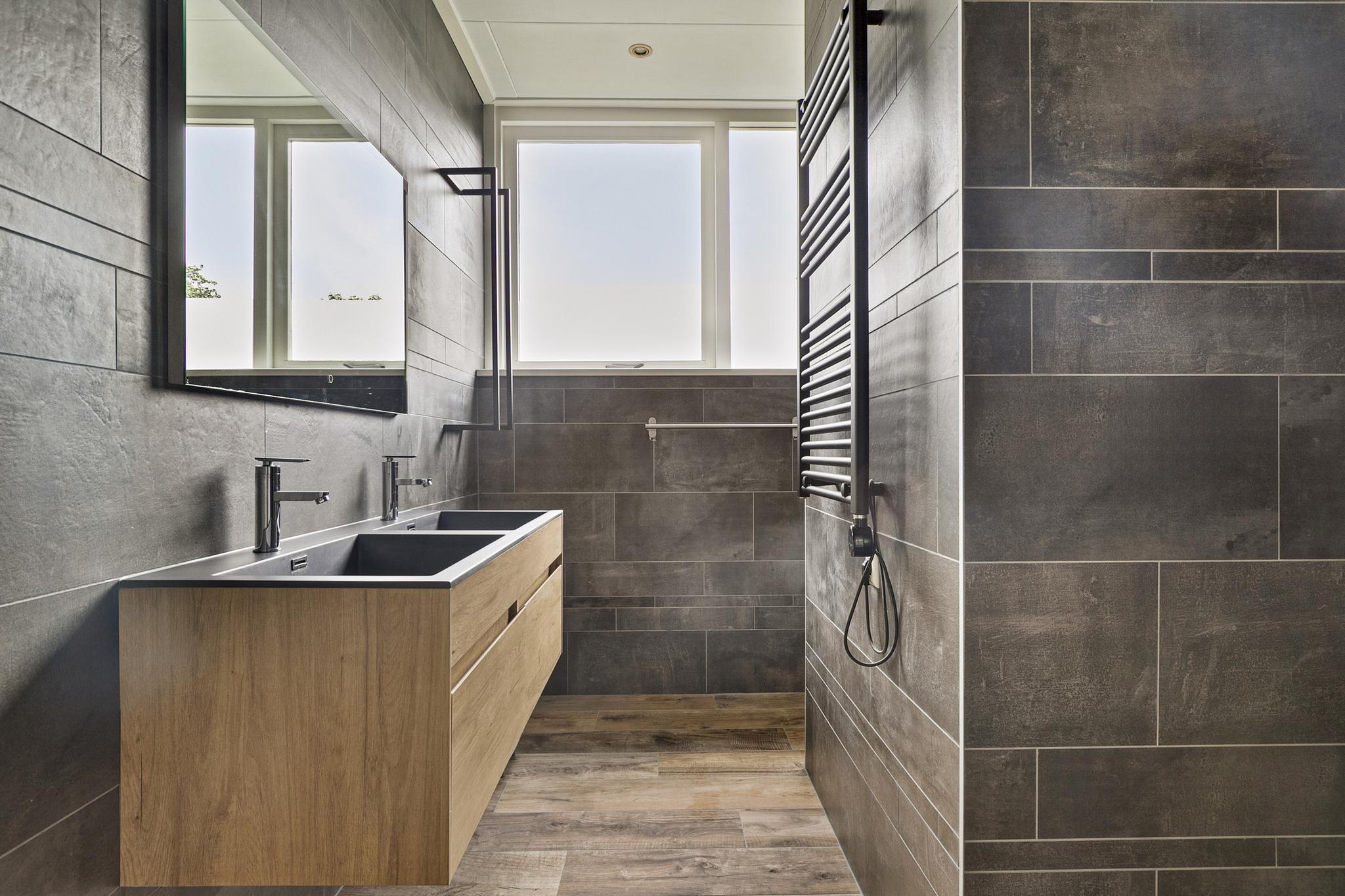 1e verdieping: Overloop, 4 slaapkamers (ouderslaapkamer met inloopkast), luxe en moderne badkamer met dubbele wastafel, inloopdouche en toilet.