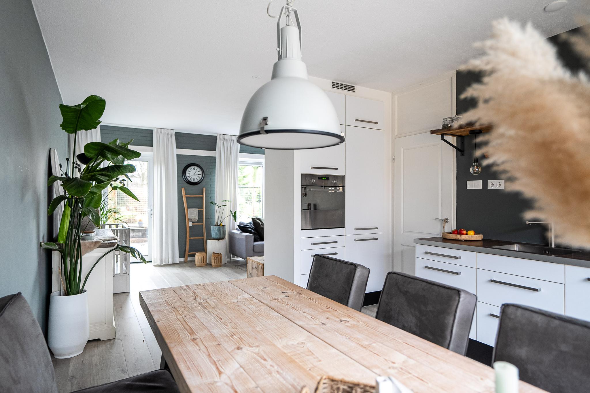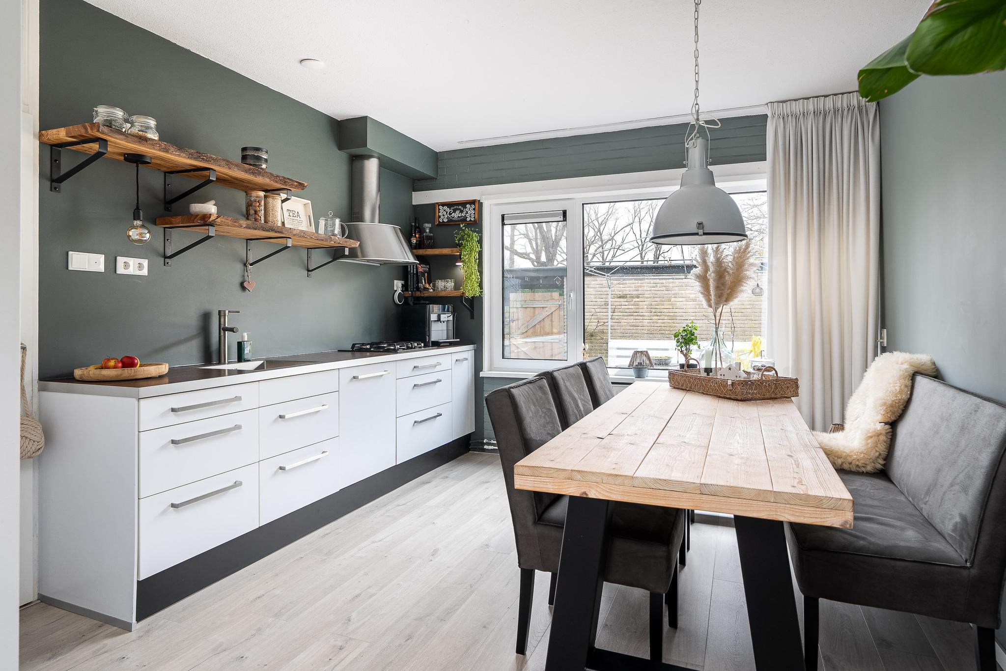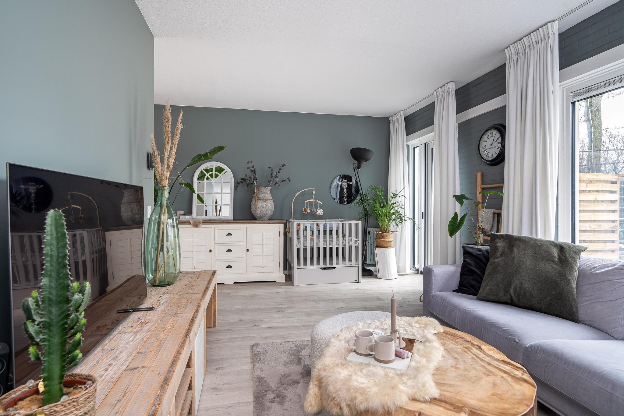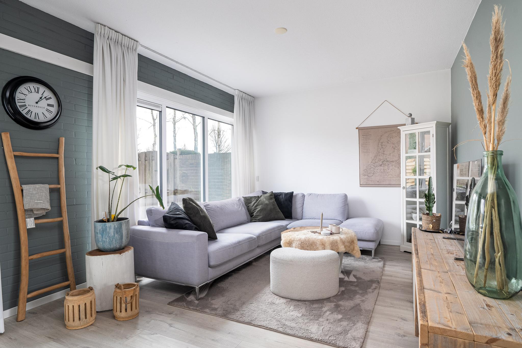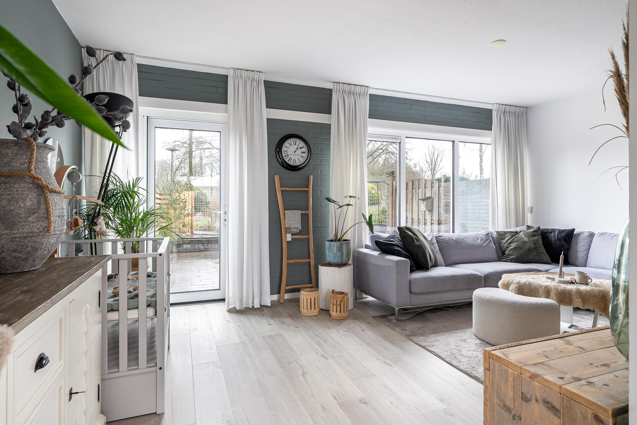 De woonkamer beschikt over grote raampartijen die zorgen voor veel daglicht. Hier geniet je van een warme, uitnodigende sfeer en heb je een mooi uitzicht op de diepe achtertuin.