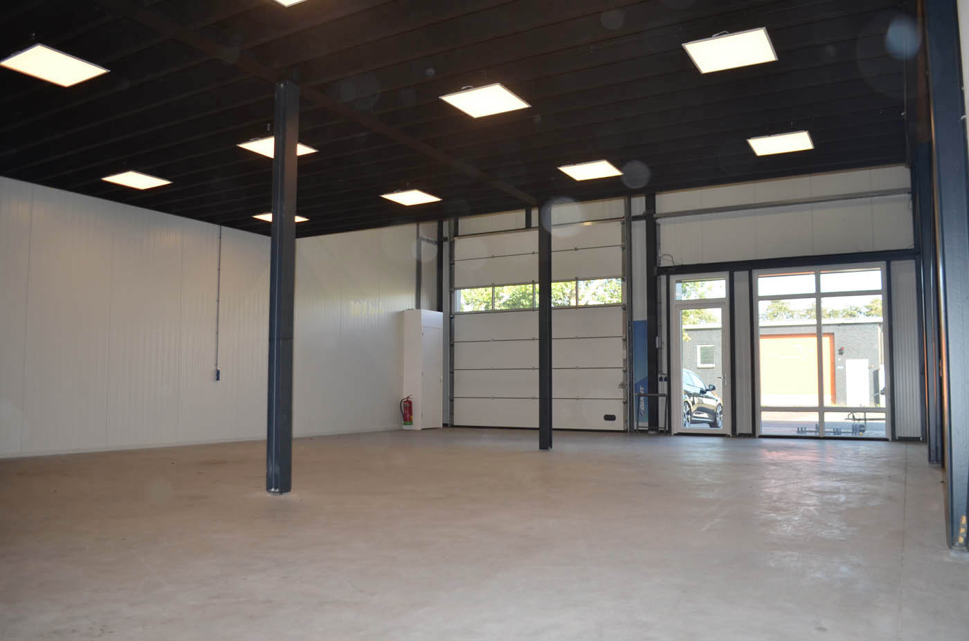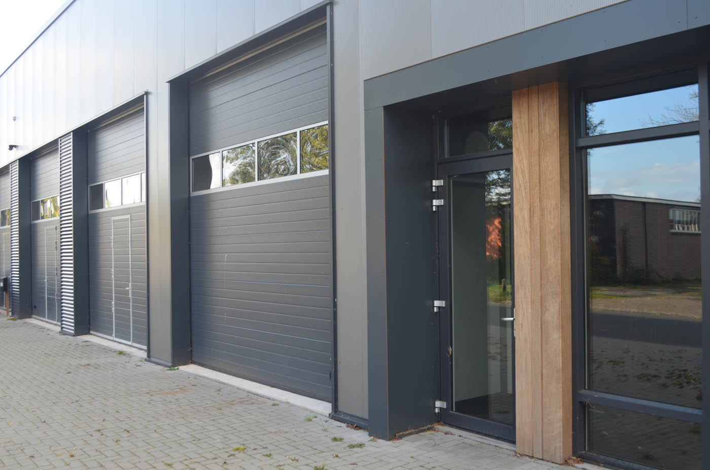 Raampartijen en loopdeuren zijn gemaakt van kunststof kozijnen. De kozijnen zijn voorzien van HR++ beglazing. De overheaddeuren zijn gemaakt van 40mm sandwich panelen met een afmeting 4000mm breed x 4200mm hoog voorzien van een loopdeur en een rij ruitjes.